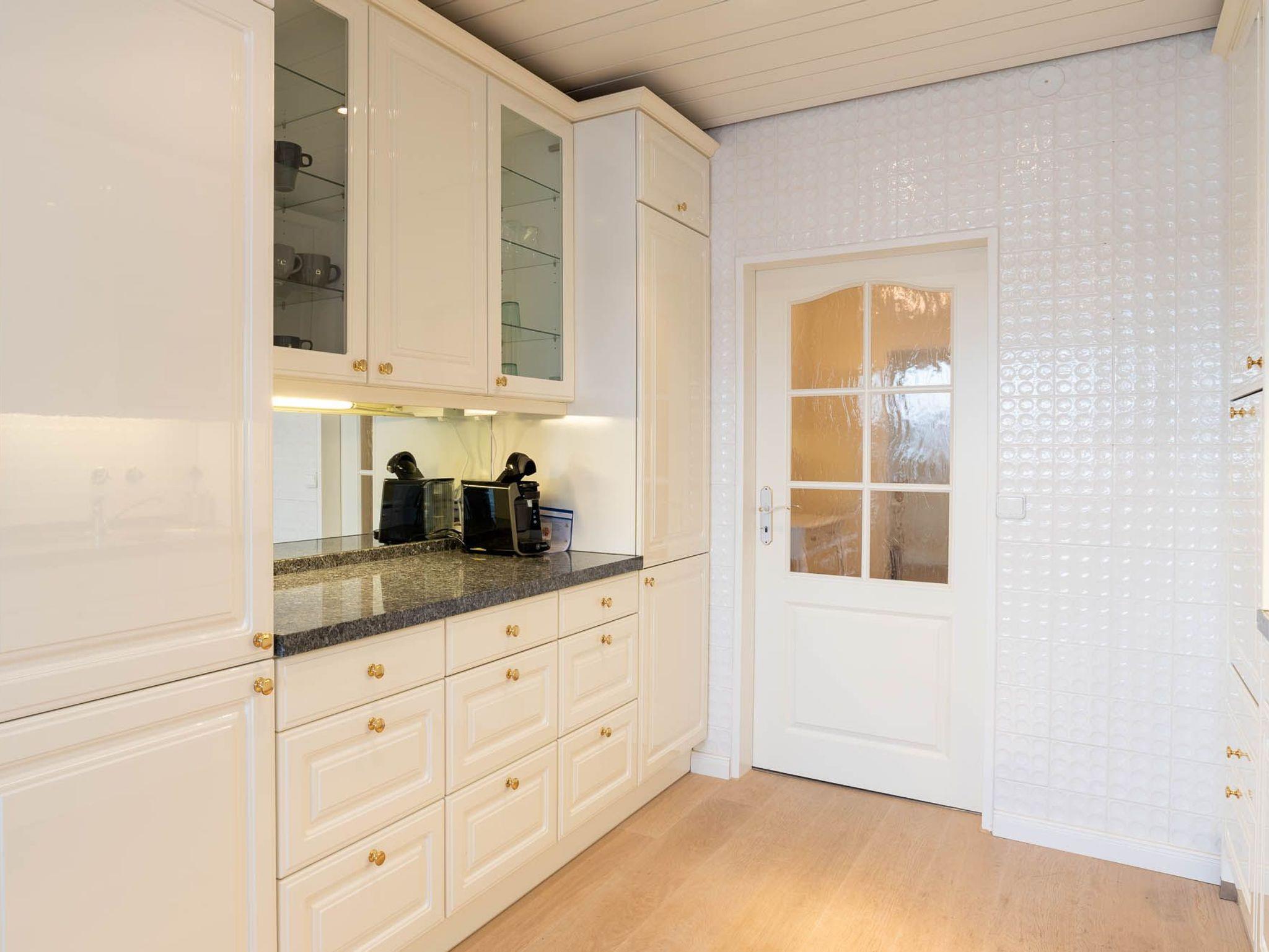 Die Küche im Landhausstil ist mit allen nötigen Haushaltsgeräten ausgestattet, damit Sie während Ihres Aufenthalts kochen und backen können. Neben einem großen Kühlschrank und Gefrierfach befindet sich eine Filterkaffeemaschine, eine Tassimo Kapselmaschine, ein Wasserkocher und ein Toaster in der Küche.