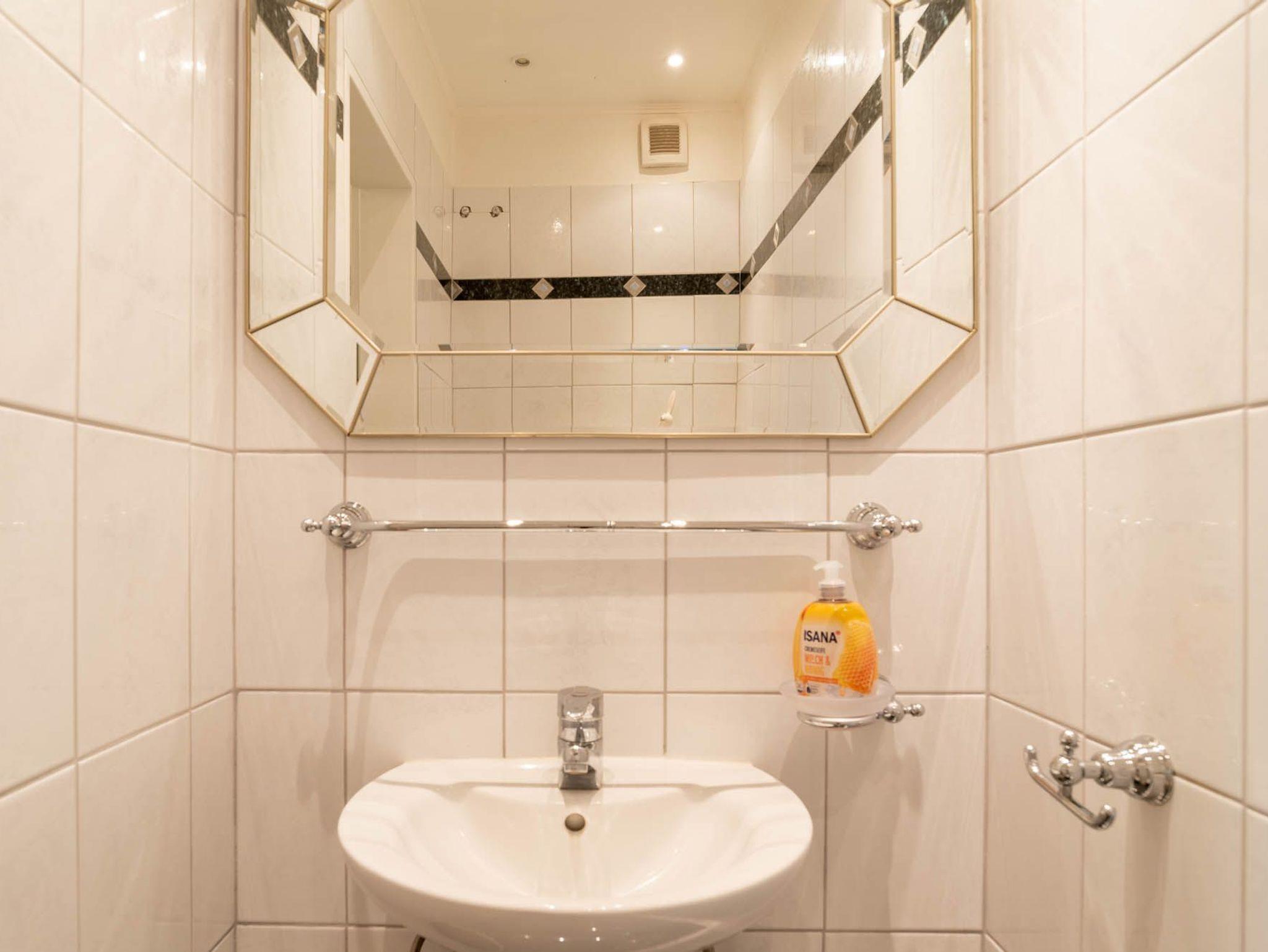 Das Gäste-Badezimmer (WC und Waschbecken) befindet sich am Eingang im Flur des Apartments. Im Flur befindet sich zudem ein großer Garderobenschrank.