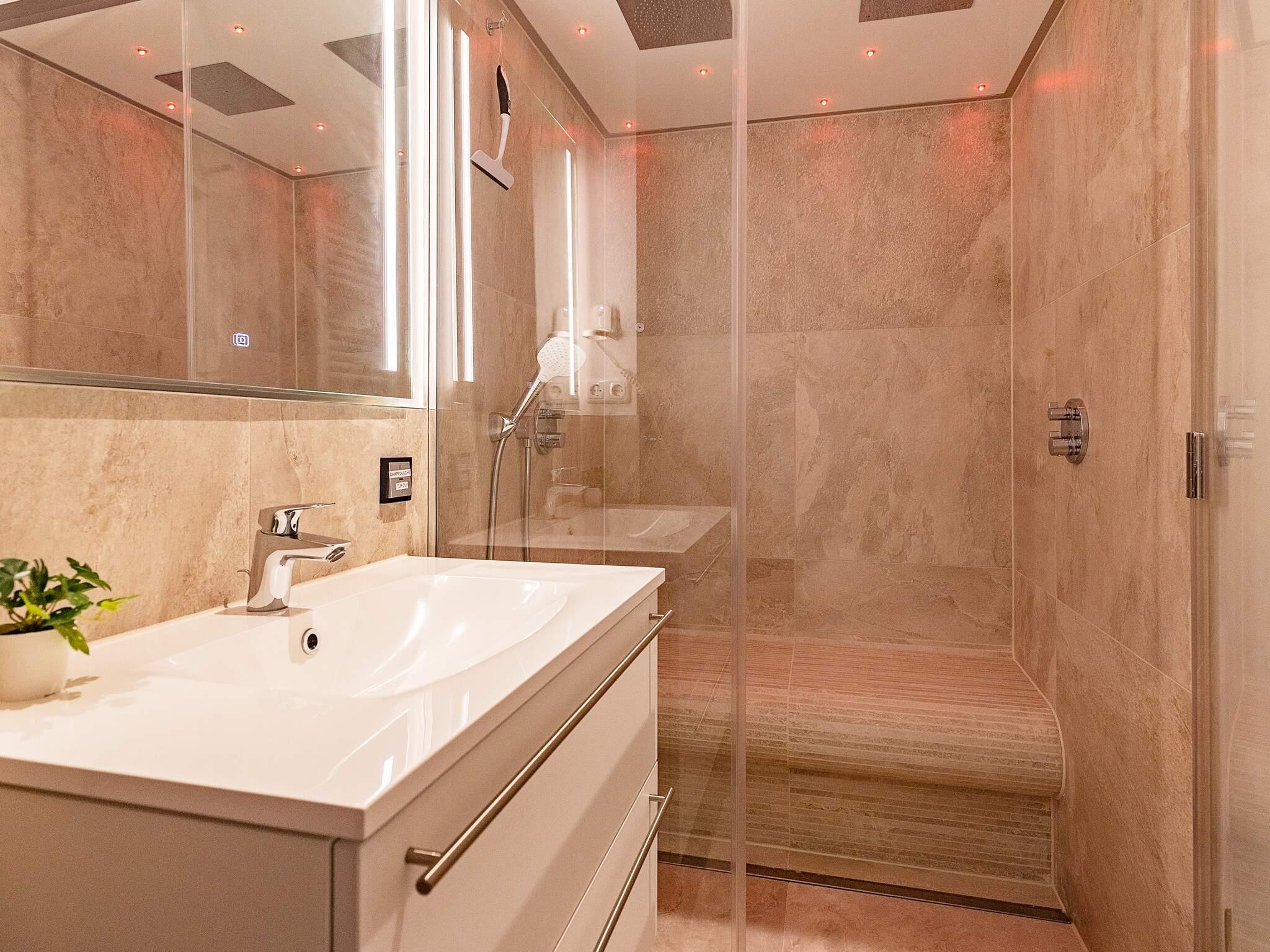 Bad: WC, Waschb., Dusche, Dampfkabine, Fußbodenheiz.
