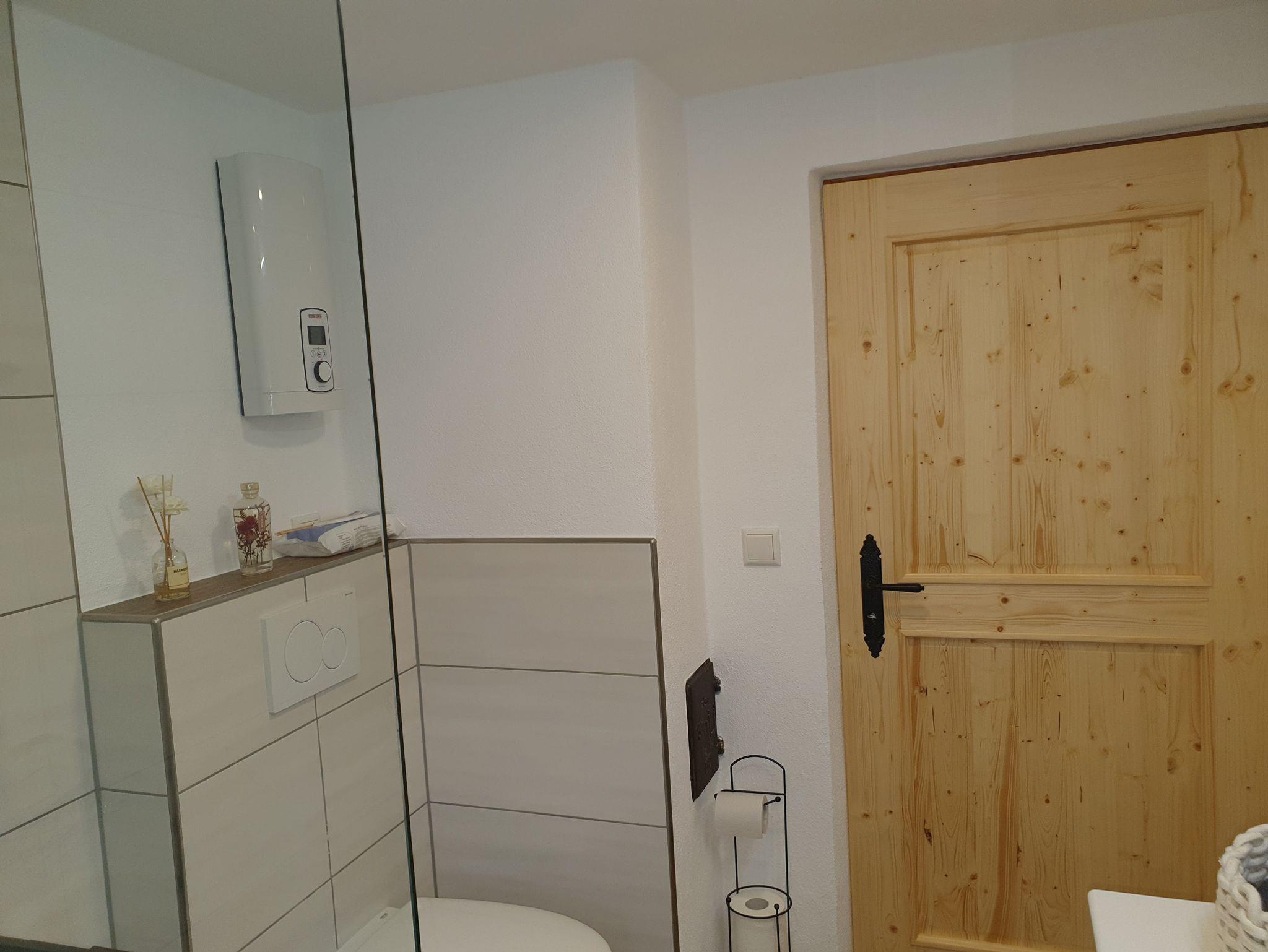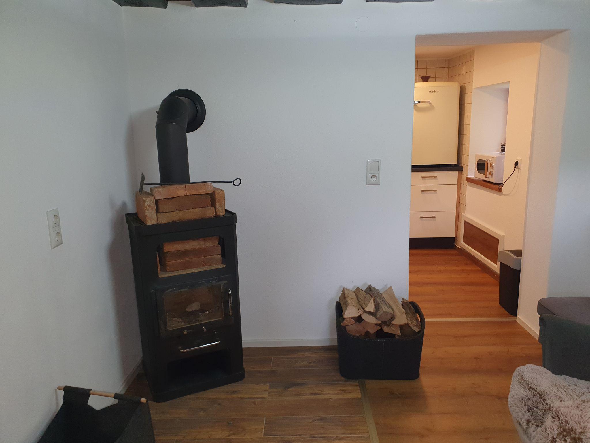 Holzofen in der Stube und mit einer elektrischen Fußbodenheizung im Bad.