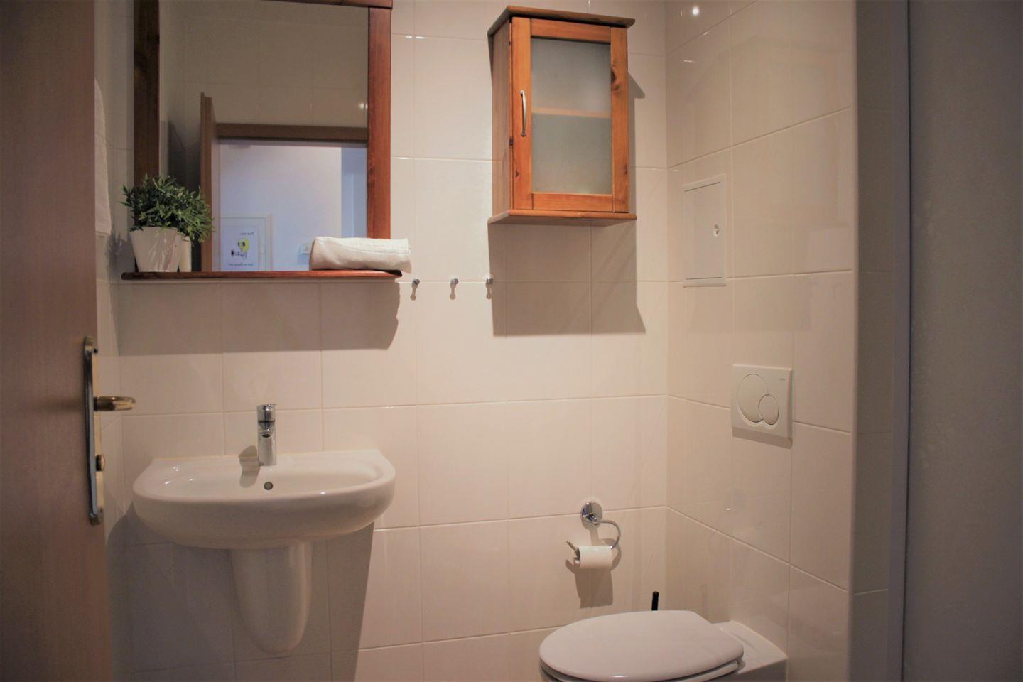 Das Schlafzimmer ist mit einem Doppelbett und Stauraum für Ihre Garderobe möbliert. Zwei weitere Personen finden auf der Schlafcouch im Wohnzimmer einen Schlafplatz. Im Badezimmer stehen eine Dusche, ein Waschtisch und WC zu Ihrer Verfügung.