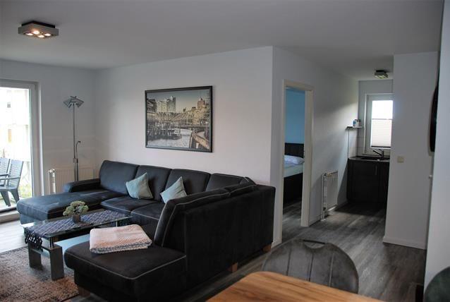Der moderne und kombinierte Wohn- und Essbereich ist mit einer komfortablen, großzügigen Sofalandschaft und einem TV-Gerät eingerichtet und verfügt über den Zugang zum möblierten Balkon. Von hier haben Sie einen seitlichen Blick auf die Kirchsee und die Wismarbucht.