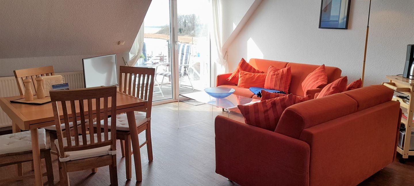 Im hellen und offen gestalteten Wohn- und Esszimmer stehen Ihnen eine gemütliche Couch, ein TV-Gerät und der Esstisch zur Verfügung. Außerdem haben Sie hier Zugang zum Balkon, der Ihnen einen unverbauten Blick auf die Kirchsee und dem bunten Treiben auf dem Wasser z.B. dem Trainieren der Drachenbootfahrer, den Fischern, dem An- und Ablegen der Segel/Motoryachten und der Fähre von und nach Wismar zu schauen.