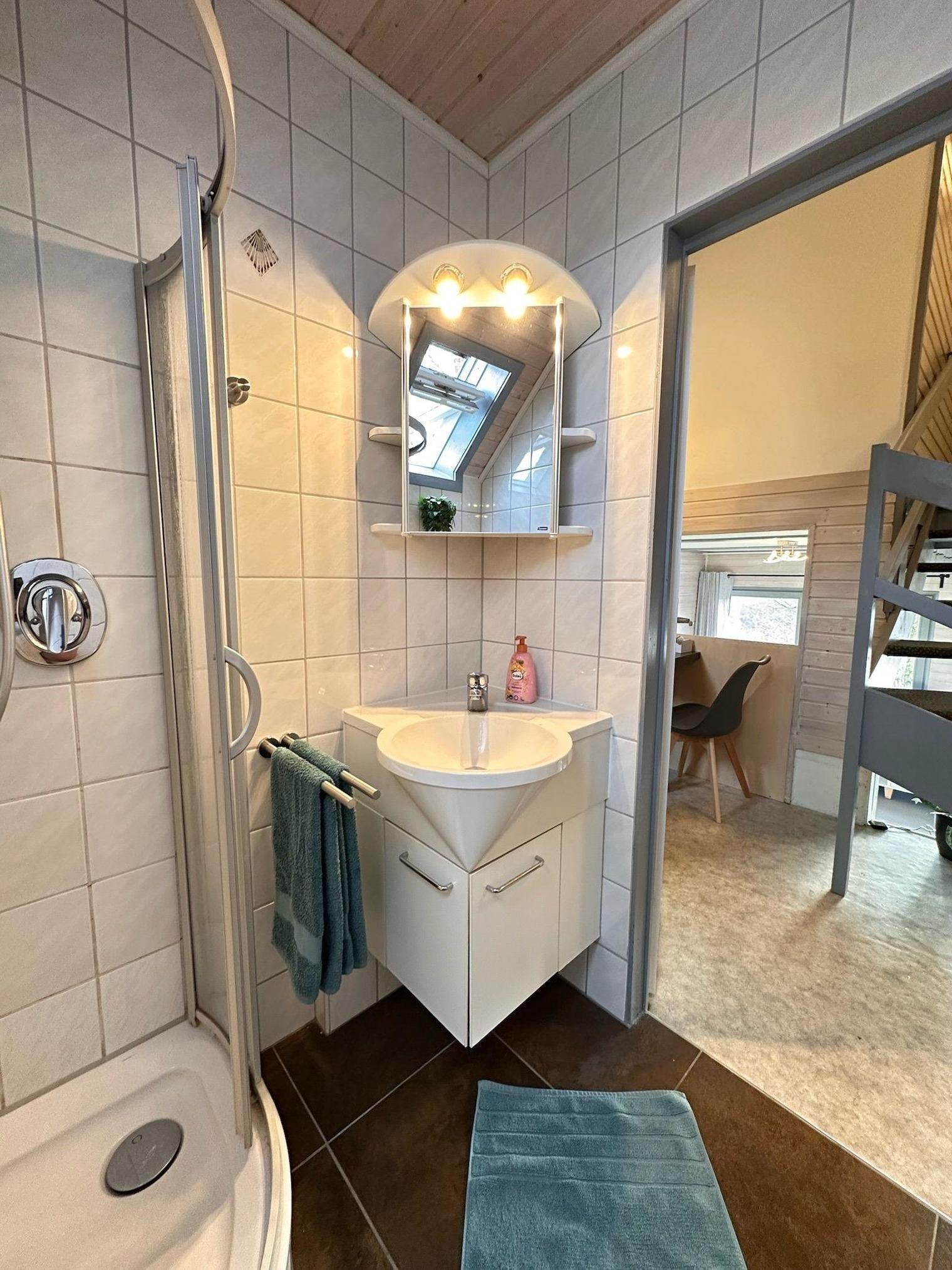 Im Wohnbereich erwartet dich eine gemütliche Sitzecke mit Satelliten-TV, Fire TV Stick und Radio. Ein Kaminofen sorgt für behagliche Wärme. Der große Esstisch bietet Platz für 6 Personen und ein Kinderhochstuhl steht ebenfalls zur Verfügung.