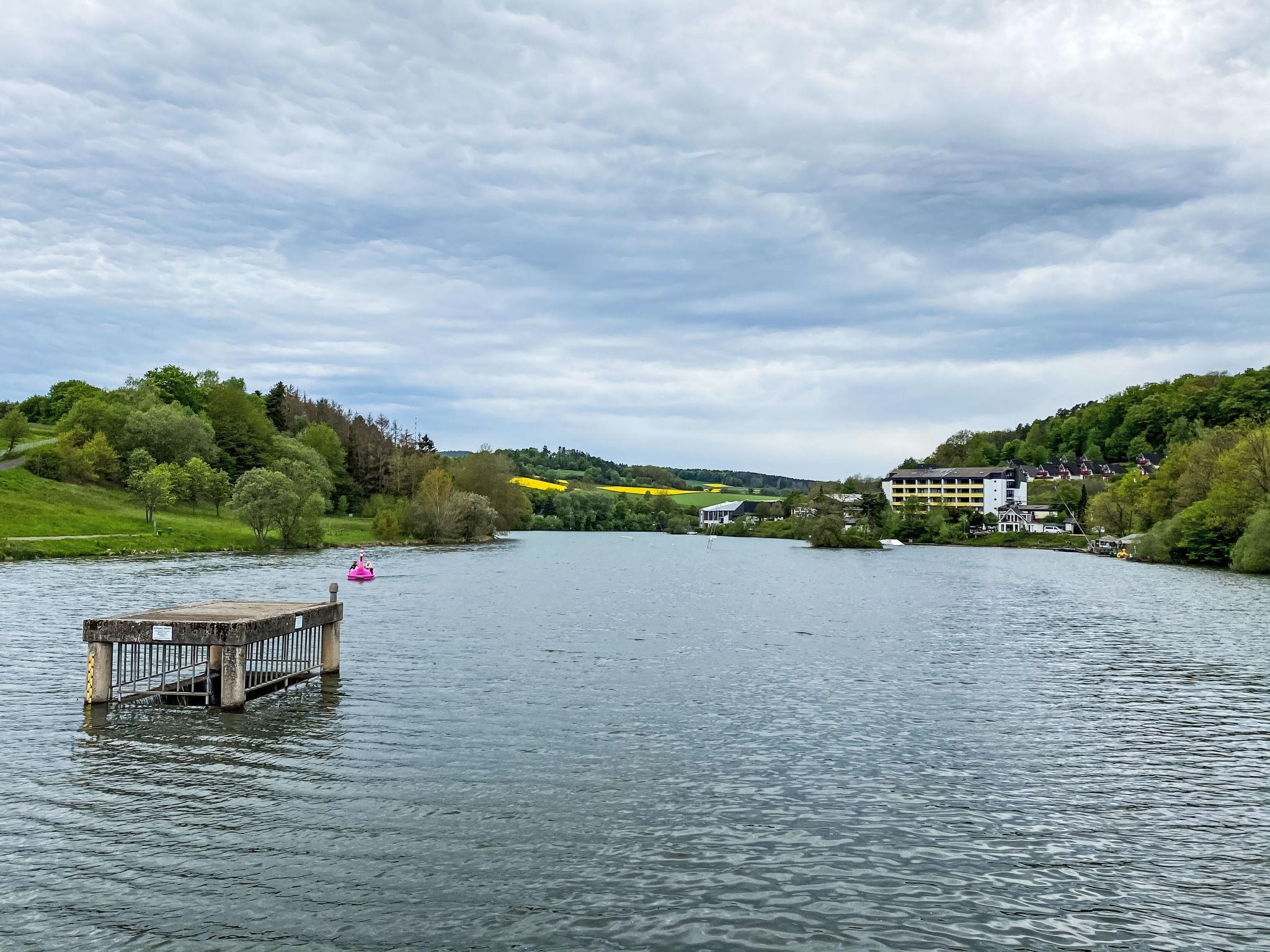 Holiday village "Seepark Kirchheim". Outside the resort, 4 km from the centre of Kirchheim, in a quiet, sunny position on a slope, on the lake, in the countryside. Public parking on the road. Shop 4 km, supermarket 4 km, shopping centre 4 km, bakery 4 km, café 400 m, bus stop 400 m, railway station "Bad Hersfeld" 15 km, outdoor swimming pool 4 km, thermal baths 15 km. Golf course (18 hole) 4 km, tennis 10 km, minigolf 15 km, walking paths from the house 300 m. Well-known lakes can easily be reached: Stausee 500 m. Please note: car recommended. The owner does not accept any youth groups. The Seepark is divided into four “villages” with a total of 139 holiday homes, which are grouped around the reservoir (10 hectares of water, bathing, water skiing, sunbathing area). Route around lake is ideal for walking and jogging.