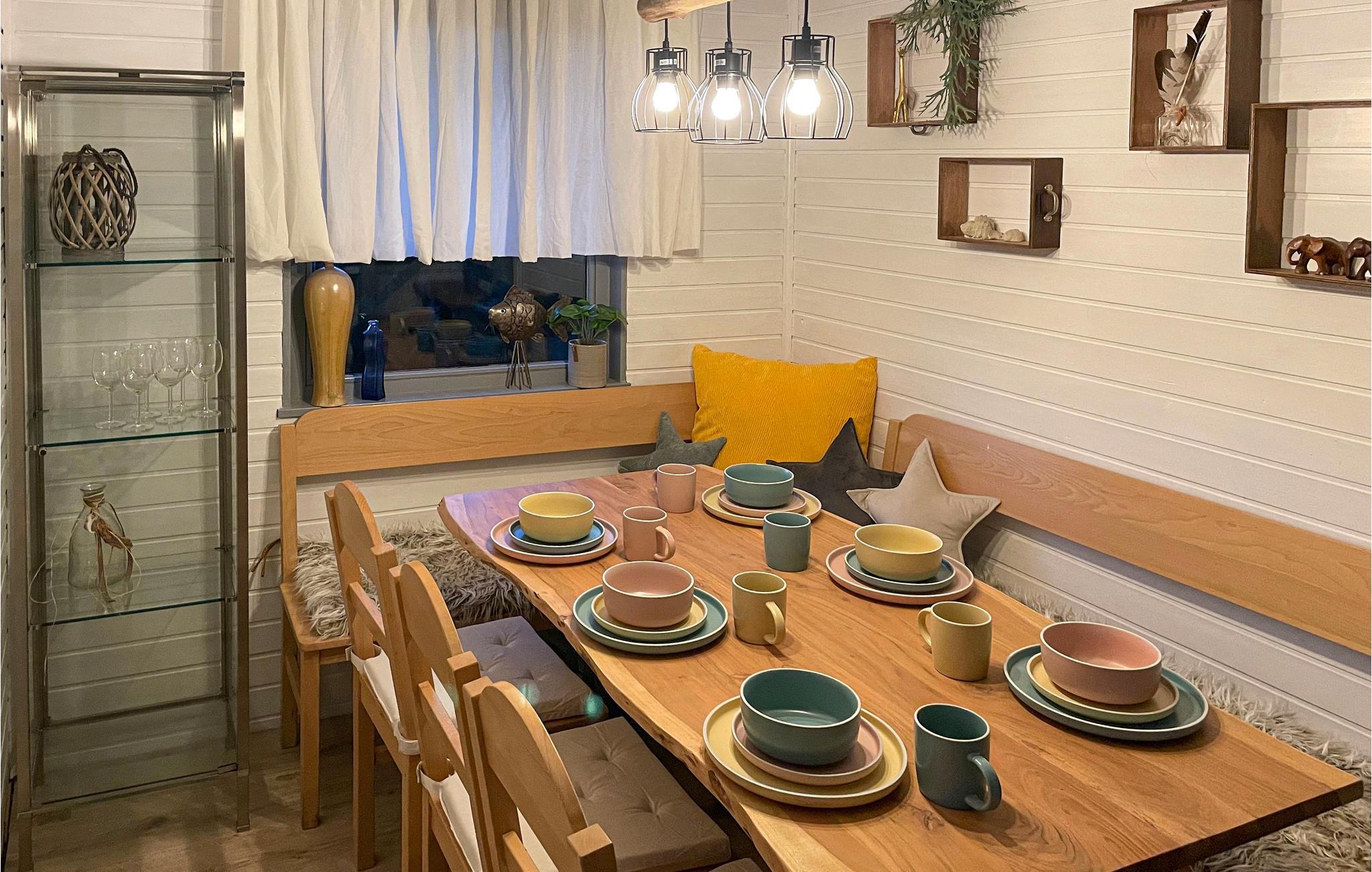 Sie betreten das Haus durch eine kleine Diele, mit ausreichend Platz für Jacken, Schuhe und Hundezubehör. Von hier aus gelangen Sie in den gemütlichen Wohn-/Essbereich. Die Essecke bietet Platz für 7 Personen - ein vorhandener Babystuhl kann problemlos angestellt werden. Der in hellen Naturtönen und sonnigen gelb eingerichtete Wohnbereich bietet ein großes, kuscheliges Ecksofa. Ein Kamin und eine Klimaanlage ermöglichen immer die richtige Temperatur. SAT-TV, W-LAN, Musik und Gesellschaftsspiele bieten Unterhaltung.