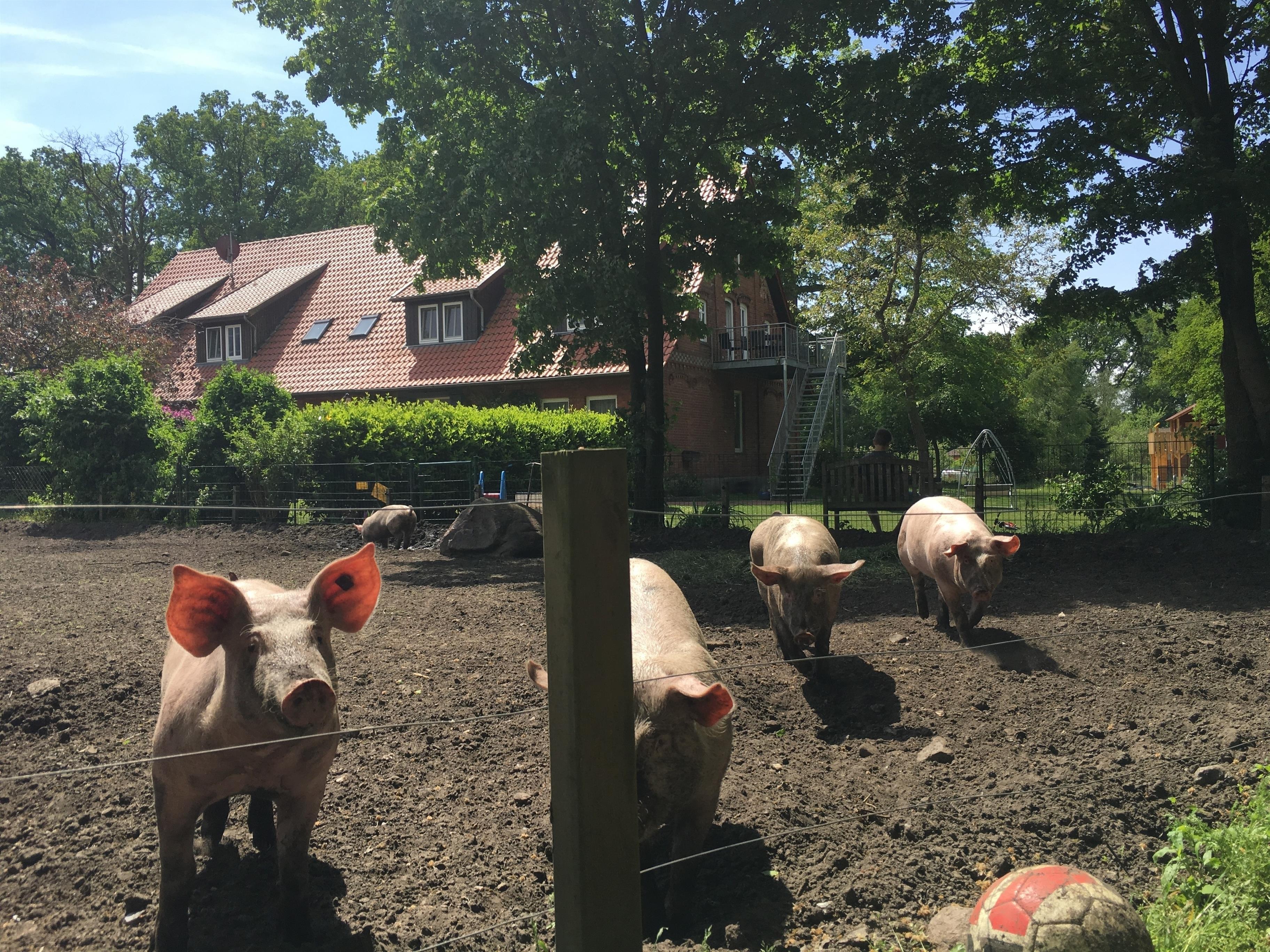 Auf den Wiesen rund um den Hof laufen unsere Tiere wie Schweine, Hühner, Esel & Ziegen herum.