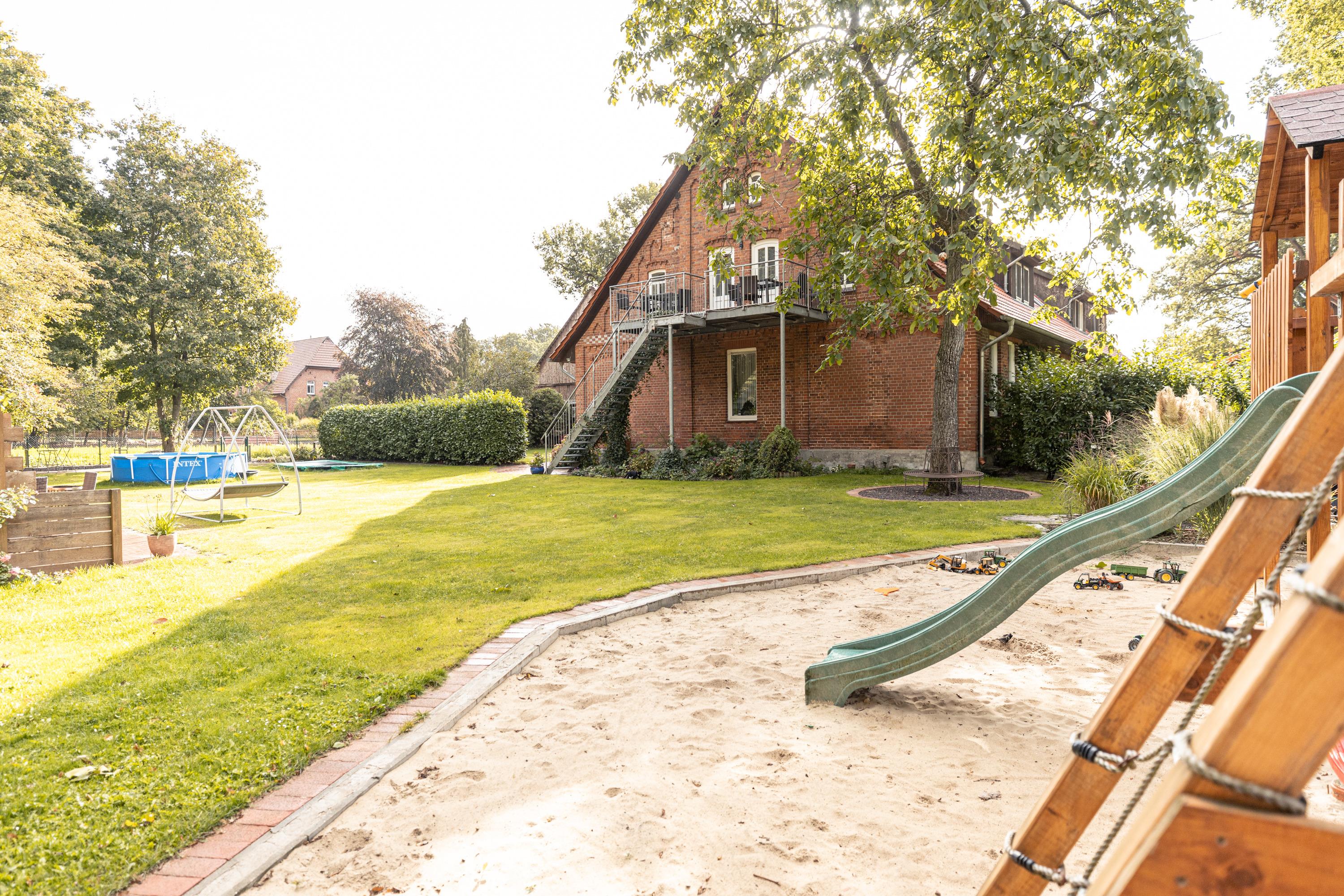 Erobern Sie den Hof mit großem Garten, Sandkasten, Spielplatz, 2 Terrassen, Grillplatz und Streicheltieren.