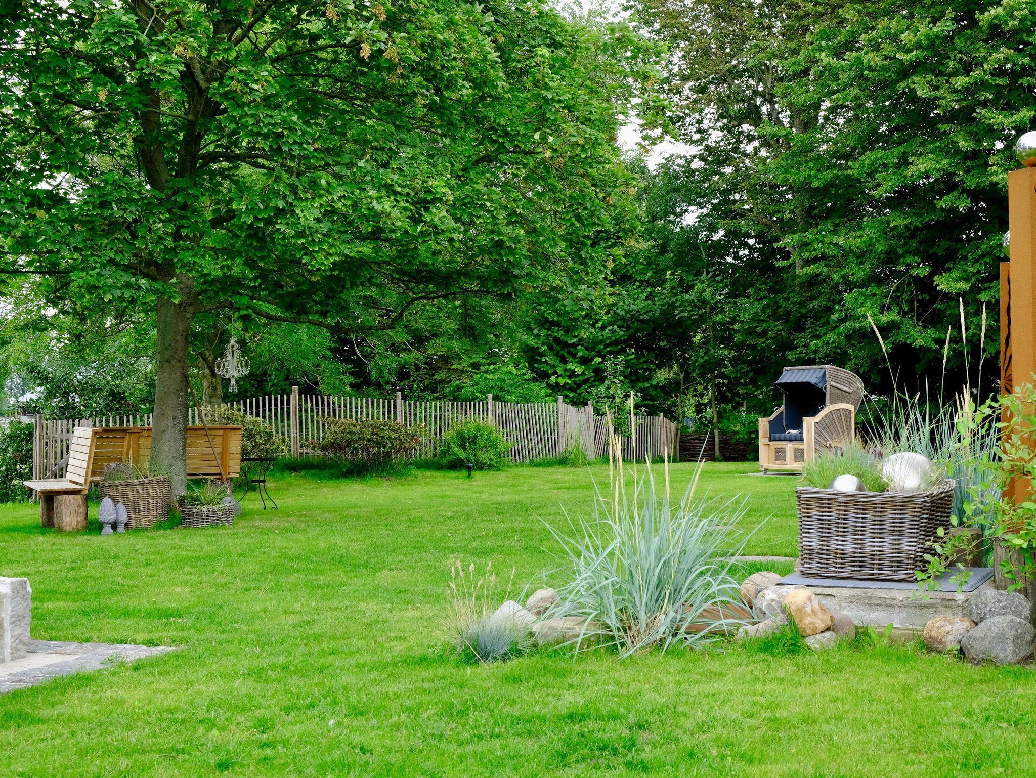In den Monaten April-Oktober erfreuen Sie sich über Ihren persönlichen bequemen Strandkorb der Firma Schreiner aus Heide. Ganzjährig steht Ihnen die Baumbank, die Lounge-Sessel am Gartenteich, der Sitzplatz mit Tisch unter den Linden sowie die Bank in der Buddha-Ecke zur Verfügung.