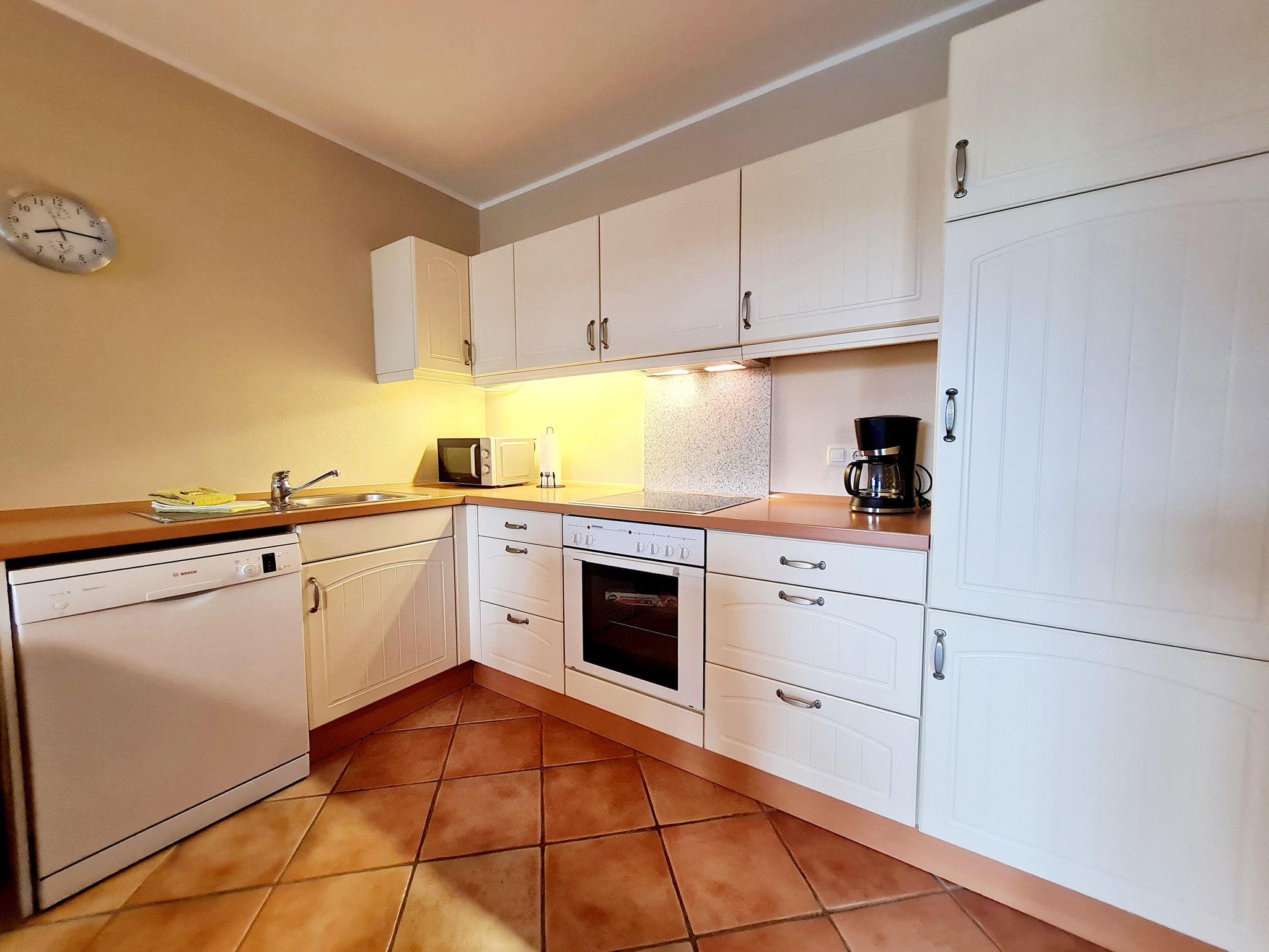Der Wohnraum ist mit gemütlicher Sitz- und Essecke, Sat-TV sowie einer vollständig ausgestatteter Küchenzeile (inkl. Geschirrspüler, Mikrowelle) eingerichtet .