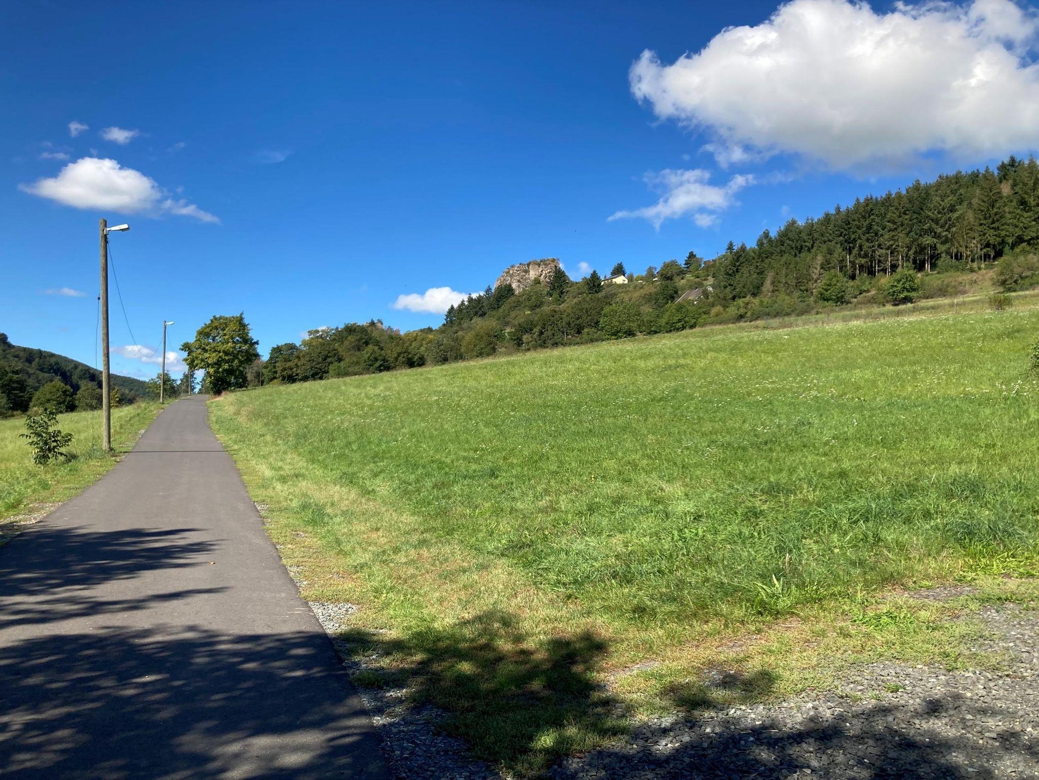 Gartenmöbel sind für die Terrasse und den Balkon vorhanden. Blick auf die Kirner Dolomiten und die Kyrburg. Mehr unter www.muehle-heimweiler.de