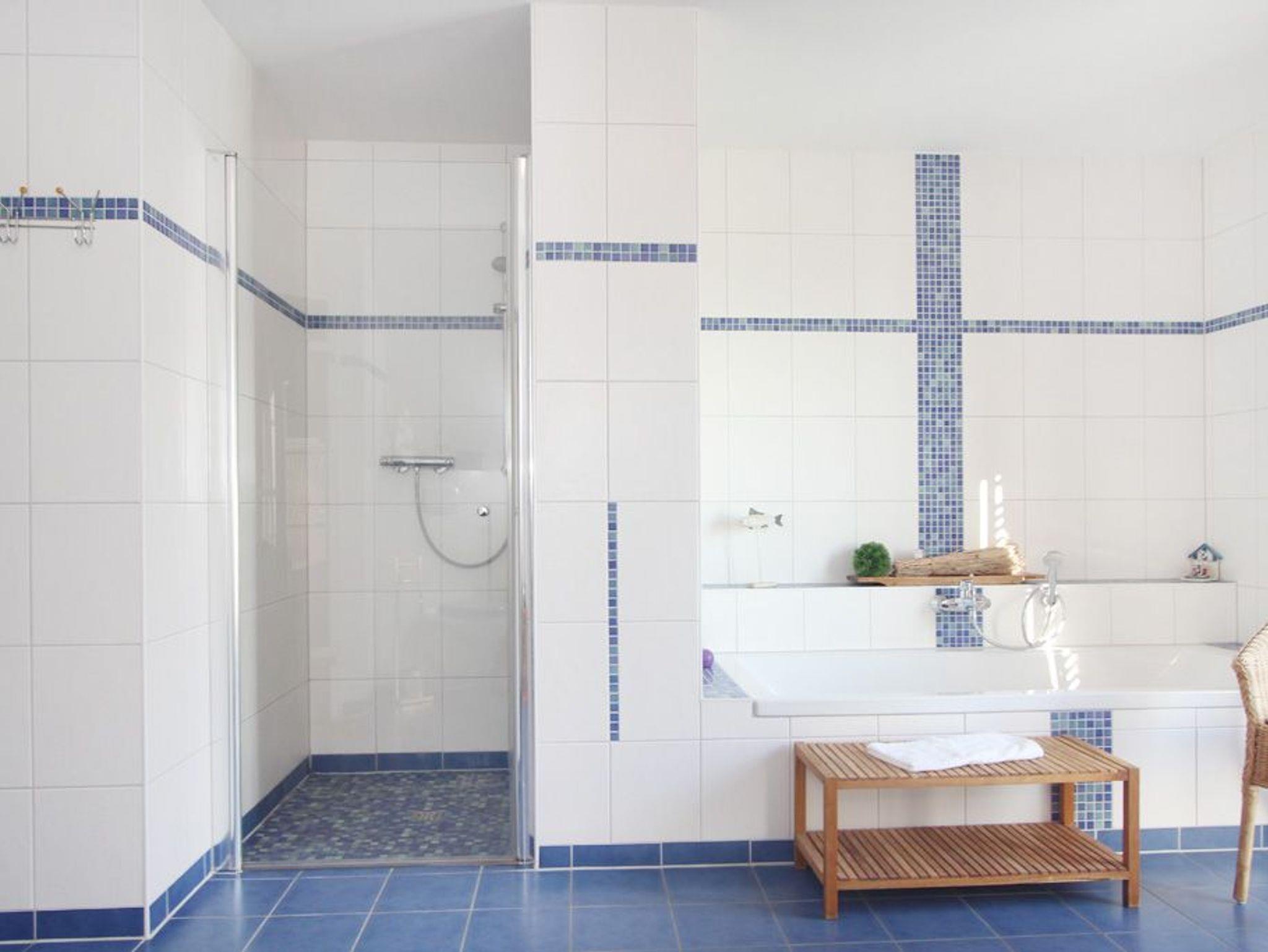 Im Badezimmer gibt es 2 Waschbecken, Dusche, WC, Badewanne und Sauna.