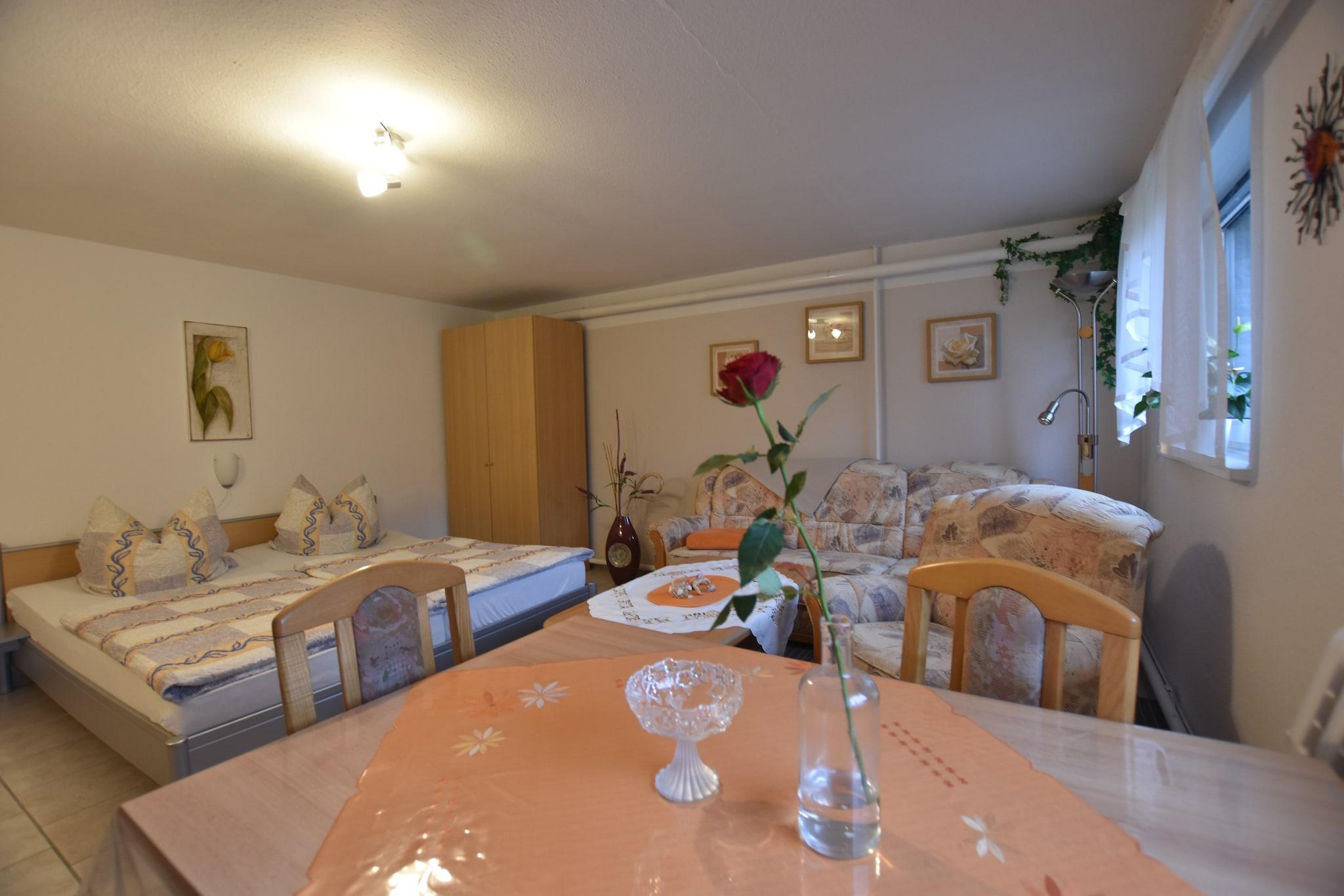 Basement: (Entrance(reachable from the outside), hallway, Kitchen(electric kettle, toaster, cooker(2 ring stoves), coffee machine, oven, microwave, fridge(+ freezer)), Living/bed room(double bed, TV, dining table, seating area, radio, CD player), bathroom(shower, washbasin, toilet), heating) terrace, garden(shared with the owner , fenced), garden furniture, BBQ(on request), parking