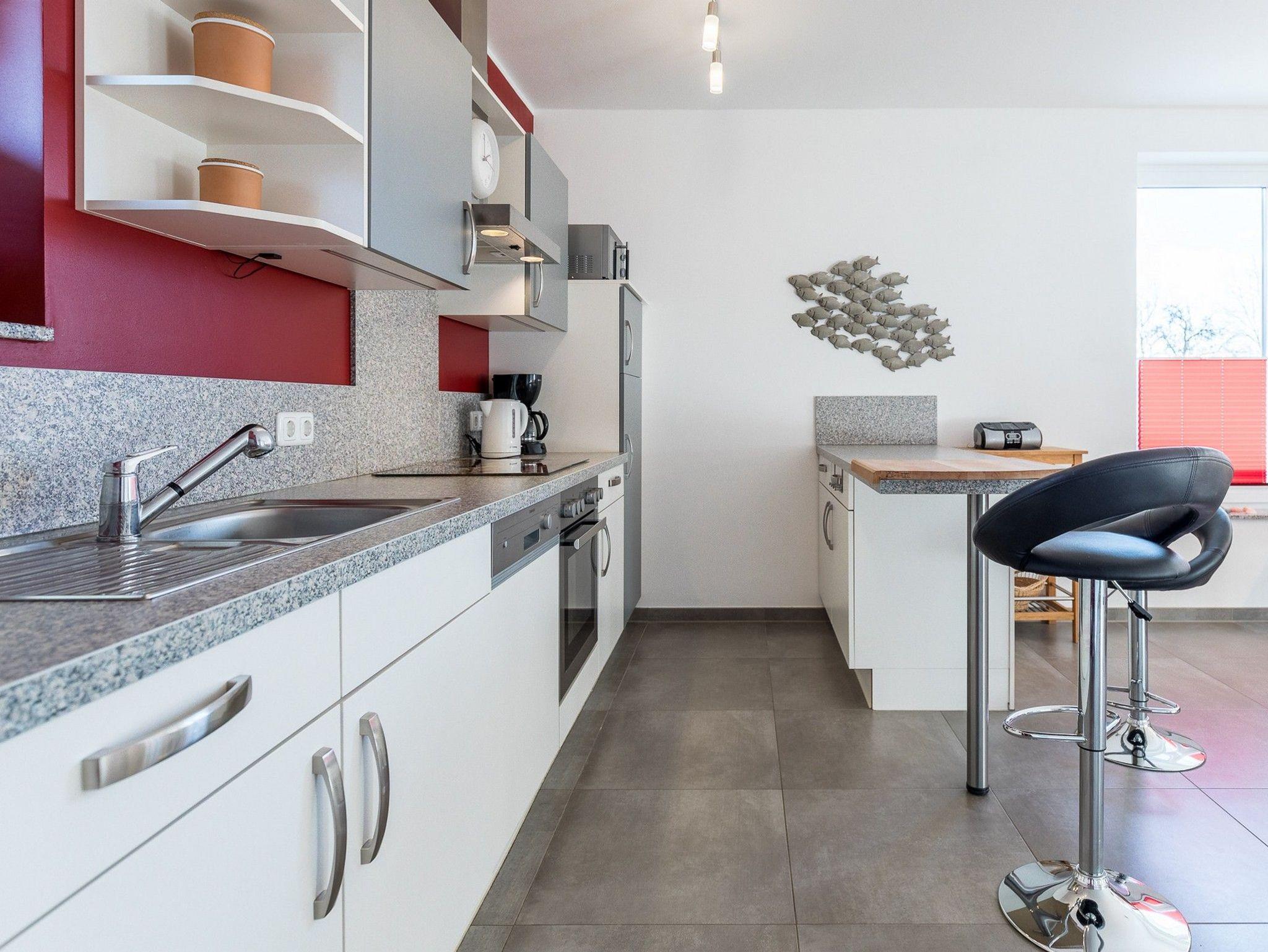 Direkt nach dem Betreten der Ferienwohnung kommen Sie in einen großen Raum, der modern ausgestatteten Küche - Wohn- und Esszimmer zugleich - in dessen Zentrum ein schöner, großer Esstisch steht, an dem Sie gemütlich sitzen und den Urlaub auf sich wirken lassen können.