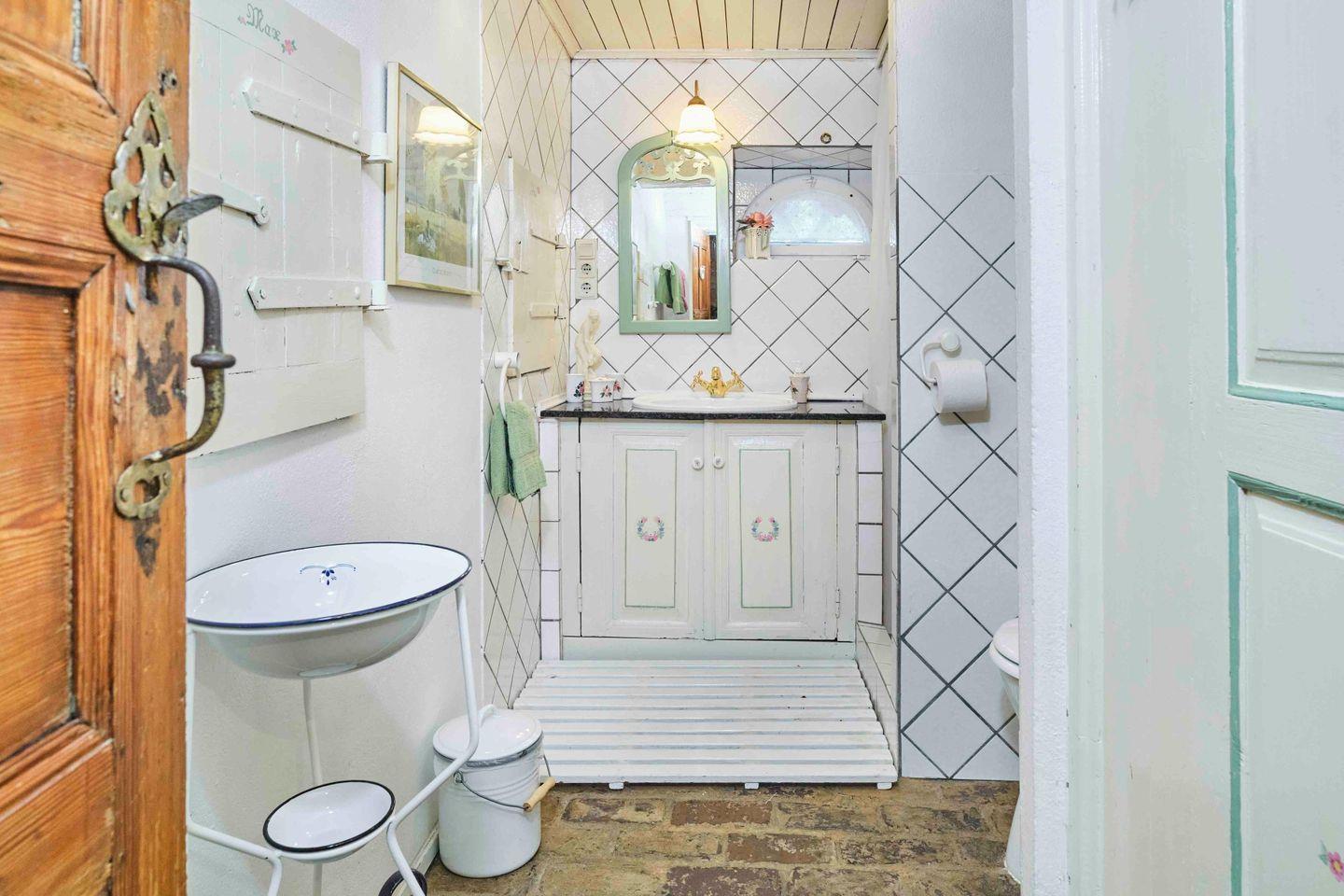 Beim Eintreten fällt sogleich die liebevolle Anordnung antiker Kleinigkeiten und teilweise antiquarische Einrichtung ins Auge. Die Küche, mit einer Balkenhöhe von nur 1,85 m, ist gemütlich und hat ihren alten Charakter bewahrt.