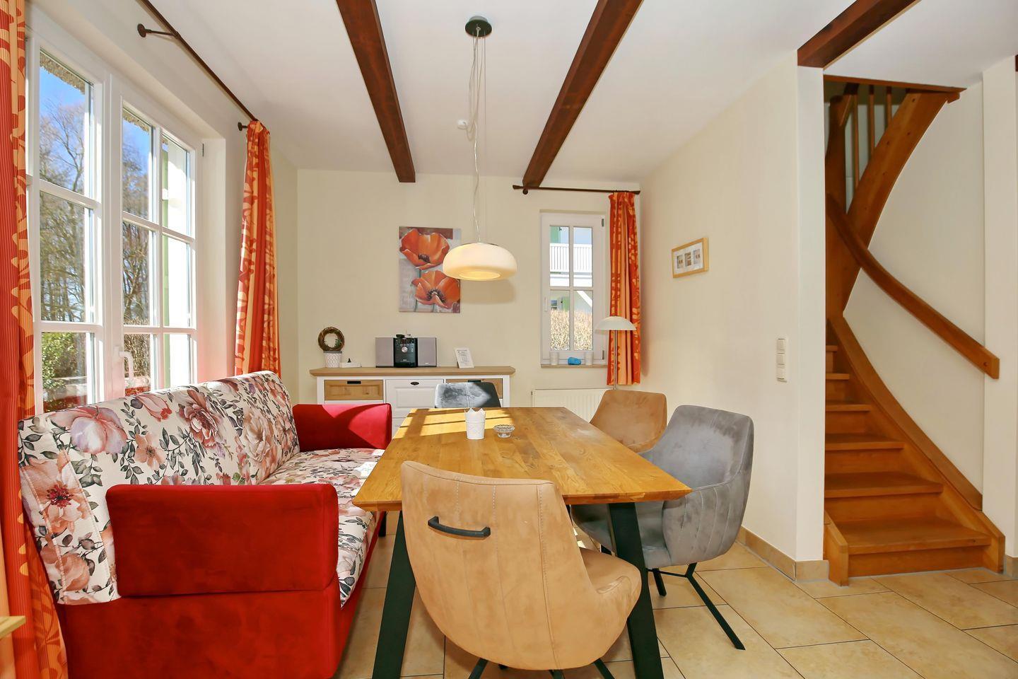 Im Erdgeschoss des Ferienhauses befindet sich der Wohnbereich. Hier laden eine Eckcouch und ein Sessel zu geselligen Abendstunden ein. Zur Unterhaltung stehen ein Flatscreen-TV, ein DVD-Player sowie eine Stereoanlage bereit. Der Essbereich ist im lichtdurchfluteten Wohnbereich integriert und bietet viel Platz für gemeinsame Mahlzeiten. Der Kamin sorgt besonders an kälteren Abenden für Gemütlichkeit und wohlige Wärme. Auf die sonnenverwöhnte Terrasse gelangst du vom Wohnbereich aus.