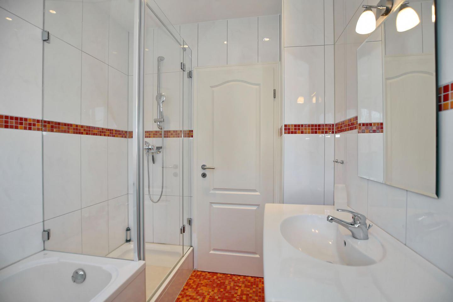 Zum Tageslichtbad im Obergeschoss mit Dusche, Wanne und WC gehören ein Waschtisch mit beleuchtetem Spiegel sowie ein Föhn und ein Handtuchtrockner. Für den Sichtschutz sind an den Fenstern Plissees angebracht. Im Bad des Obergeschosses sowie im gesamten Erdgeschoss sind Bodenfliesen verlegt. Die Schlafräume sind mit einem Holzboden ausgestattet. Das Rauchen ist im Haus „Nanni“ nicht gestattet. Haustiere sind willkommen.