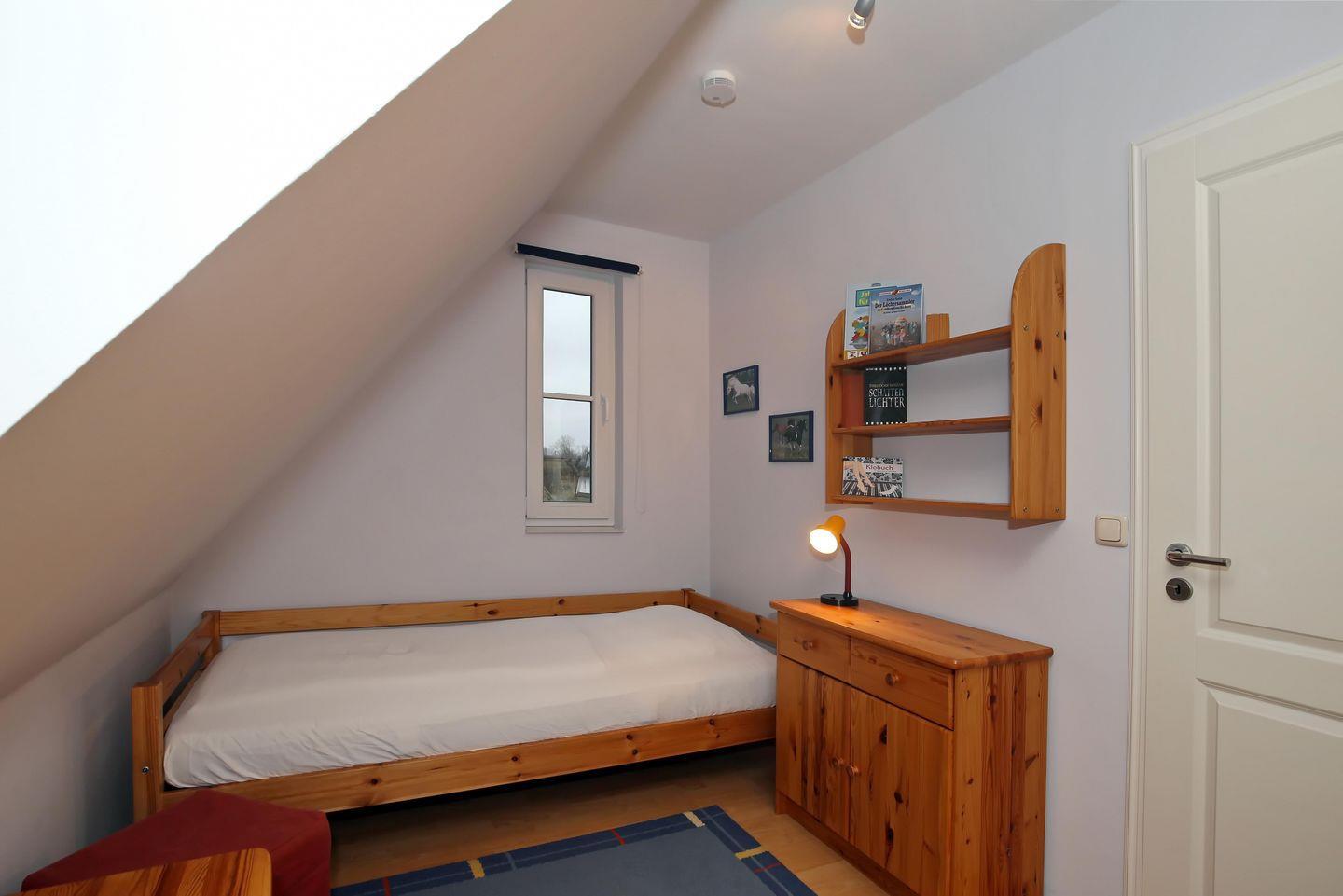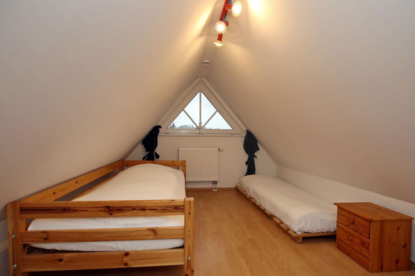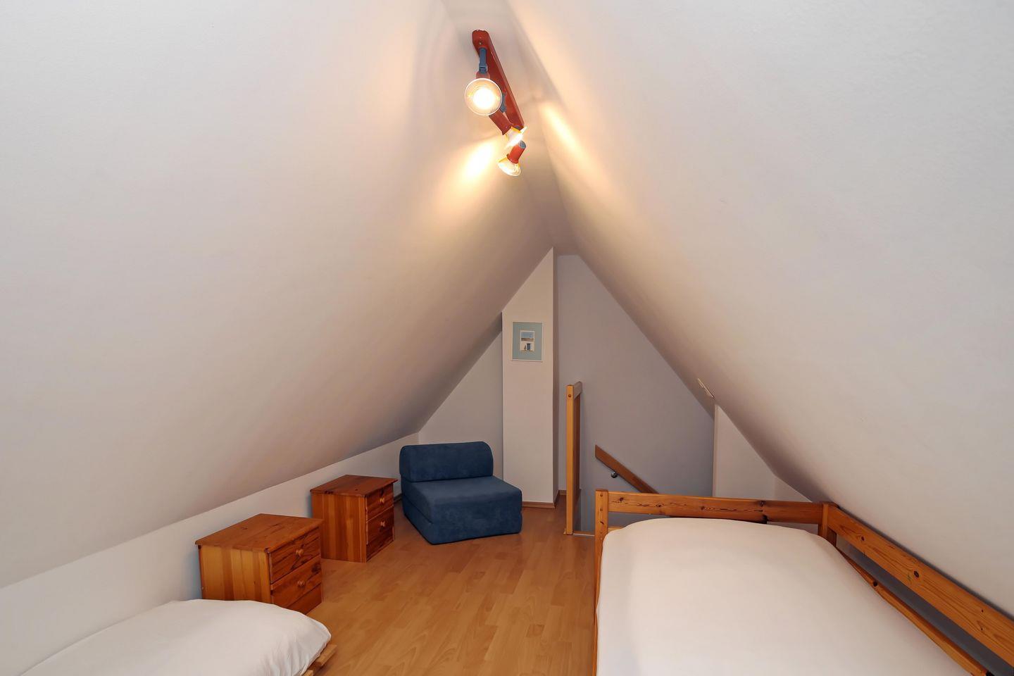 In der zweiten Etage befinden sich 2 Schlafzimmer. Das erste Schlafzimmer ist für dich mit einem komfortablen Doppelbett und einem großen Kleiderschrank eingerichtet. Im zweiten Schlafzimmer empfängt dich ein Einzelbett zur Nachtruhe. Von dort aus gelangst du über eine Treppe in den Spitzboden, in welchem sich ein weiteres Einzelbett befindet. Zum Verdunkeln gibt es Vorhänge oder Rollos.
