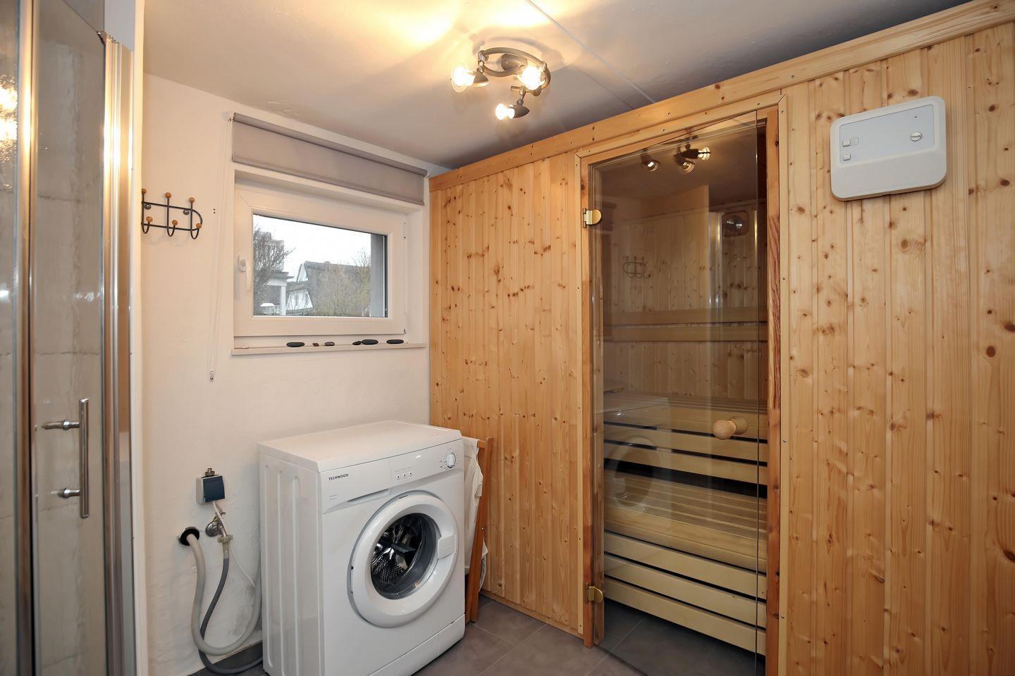 Besondere Erholung bietet dir die hauseigene kostenfreie Sauna im Erdgeschoss des Ferienhauses. Für die notwendige Erfrischung ist eine Dusche vorhanden. Neben dem Saunabereich befinden sich ein Gäste-WC und zwei kleine Aufenthaltsräume im Erdgeschoss.