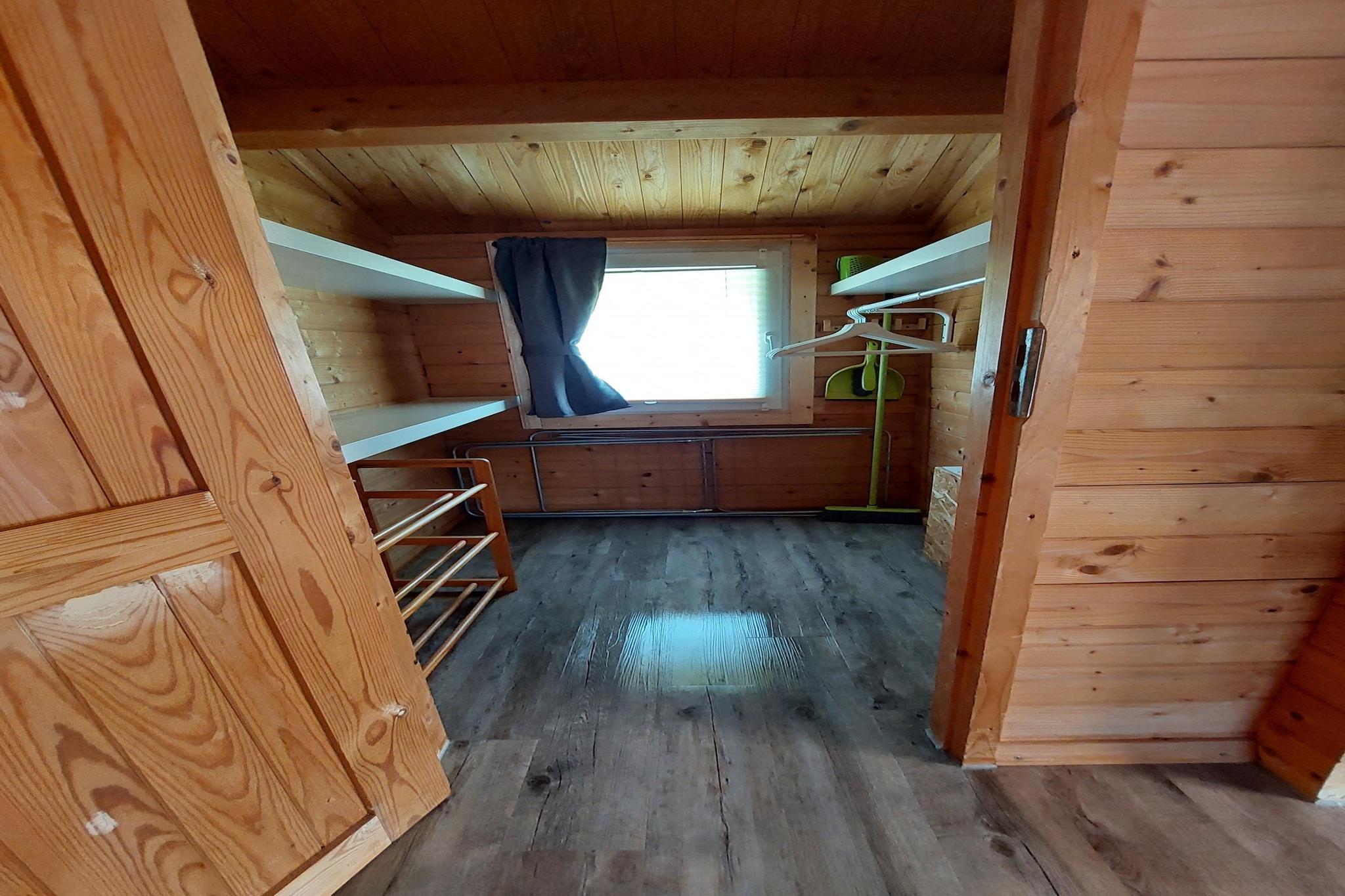 Ground floor: (open kitchen(electric kettle, toaster, cooker(4 ring stoves, ceramic), coffee machine, oven), Living/bed room(double bed, TV(flatscreen), seating area), bathroom(shower, washbasin, toilet), mezzanine(via fairly steep stairs)(double bed box), storage) carport, CD player, grill, terrace(roofed), garden(private, fenced), garden furniture, parking, lounge set, party games, toys