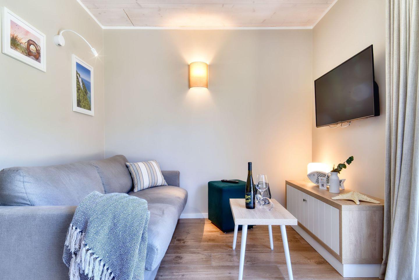 Im Feriendorf Klein Stresow werden Sie auf 43 Quadratmeter in Ihrer eigenen, stylischen Ferienhaushälfte mit Garten und Weitblick begrüßt . Hier beginnt der Urlaub für bis zu 4 Personen schon beim Eintreten. Wenn Sie es genau nehmen, schon beim Ankommen. Das Auto auf dem für Sie reservierten Stellplatz abgestellt, können Sie bei so viel sonniger Leichtigkeit erst einmal richtig durchatmen. Öffnen Sie die bodentiefen Fenster zu Ihrer Westterrasse und genießen Sie die frische Ostseebrise. Hier lässt es sich ausgezeichnet frühstücken. Das Innere Ihrer Ferienhaushälfte ist bis ins Detail aufs Feinste eingerichtet. Lampen, Möbel und Bilder sind nordisch nobel. Ein Sofa lädt zum Relaxen ein. Zur Ausstattung des Wohn-Esszimmers gehört ein Flat-TV. Das WLAN können Sie kostenfrei nutzen. Ein schöner Esstisch mit vier Stühlen eignet sich bestens für die Mahlzeiten.