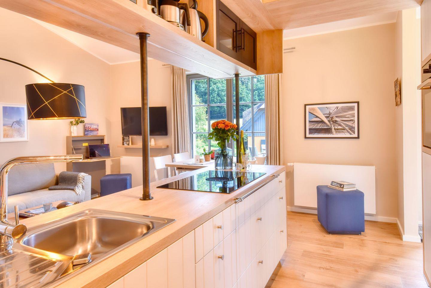 Im Feriendorf Klein Stresow werden Sie auf 53 Quadratmeter in Ihrer eigenen, stylischen Ferienhaushälfte mit Gründach und Weitblick begrüßt . Hier beginnt der Urlaub für 2 Personen schon beim Eintreten. Wenn Sie es genau nehmen, schon beim Ankommen. Das Auto auf dem für Sie reservierten Stellplatz abgestellt, können Sie bei so viel sonniger Leichtigkeit erst einmal richtig durchatmen. Verweilen Sie auf der 7m² großen Sonnenterrasse mit Meerblick und genießen die frische Ostseebrise. Hier lässt es sich ausgezeichnet frühstücken. Das Innere Ihrer Ferienhaushälfte ist bis ins Detail aufs Feinste eingerichtet. Lampen, Möbel und Bilder sind nordisch nobel. Zwei Sofas laden zum Relaxen ein, ein großer lichtdurchfluteter Wohnraum von 28m² mit über 3 Meter Deckenhöhe. Zur Ausstattung des Wohn-Esszimmers gehört ein Flat-TV. Das WLAN können Sie kostenfrei nutzen. Ein schöner Esstisch mit vier Stühlen eignet sich bestens für die Mahlzeiten.