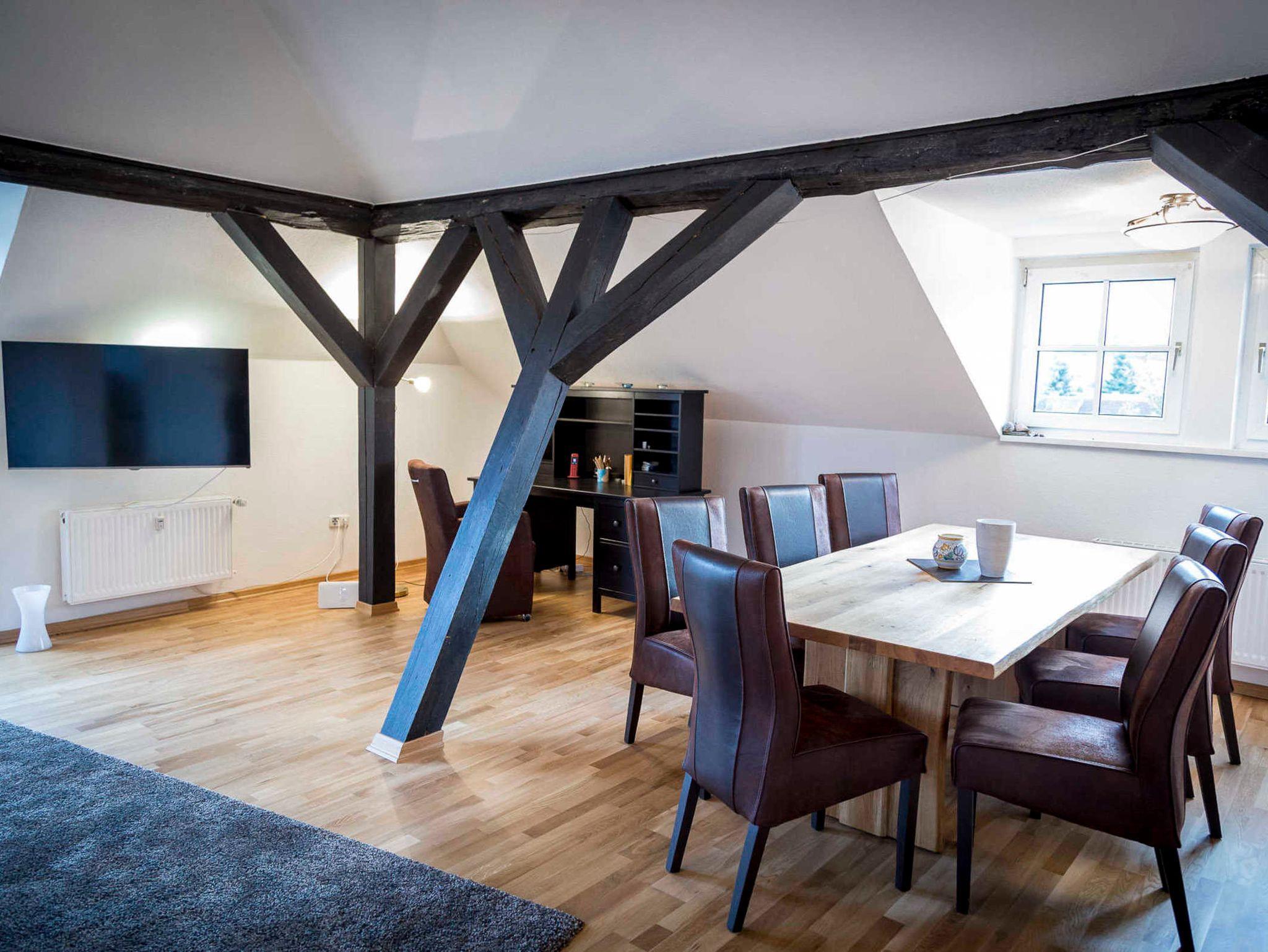 Ferienwohnung Hofblick: 120 m², 3 Schlafzimmer, für bis 6 Personen, alle mit Fernseher ausgestattet, ein schönes Bad, eine großzügige Wohnküche mit integriertem Wohnzimmer.