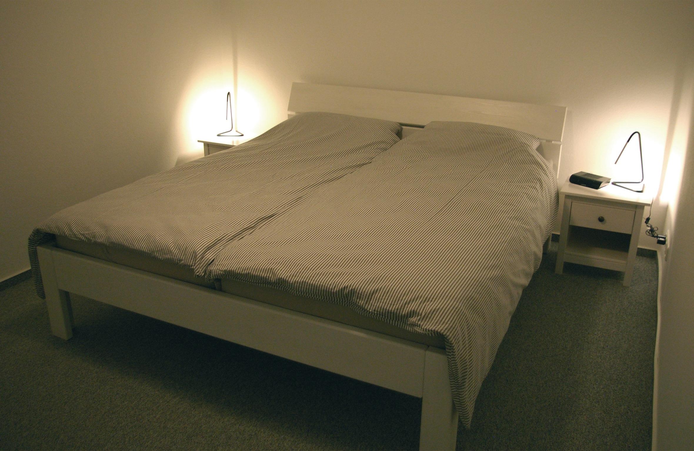 Auch das Schlafzimmer ist mit hellen Möbeln und Wänden sehr freundlich gestaltet. Doppelbett (1,80m x 2,00m) mit Nachttischen, einem großen Schrank und einem 42-Zoll LCD-Fernseher.