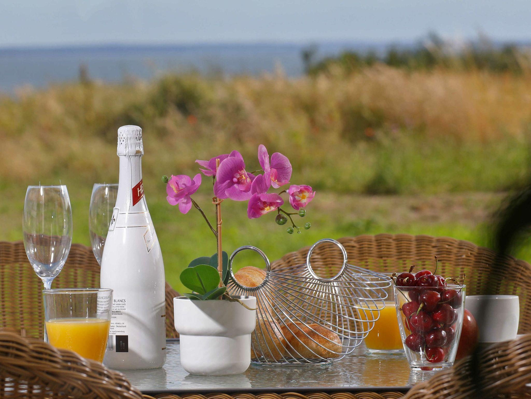 Das Architektenhaus verfügt über ca. 170 m² Wohnfläche, auf zwei Ebenen verteilt. Es erwarten Sie 4 luxuriöse Schlafzimmer, 2 vollwertige Bäder, eine eigene Sauna, ein vollausgestatteter Küchenbereich sowie ein großzügiger Wohnbereich mit einem Kaminkachelofen. Die riesige Terrasse mit Wasserblick, eigenem Strandkorb und gemütlicher Sitzgruppe lässt Sie den stressigen Alltag vergessen. Die Balkon- bzw. Terrassenmöbel stehen saisonal - in der Regel von Mai bis Ende September - zur Verfügung.