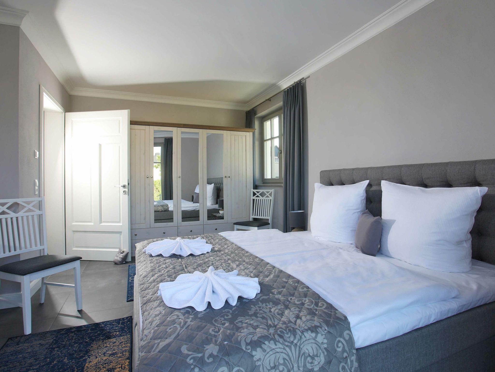 Im Erdgeschoss befinden sich auch zwei der insgesamt vier Schlafzimmer, ausgestattet mit jeweils einem Boxspringbett (180 x 200 cm) mit getrennten Matratzen und durchgehendem Topper. Vor einem der Schlafzimmer haben Sie eine weitere Terrasse zum Wohlfühlen. Ihren eigenen kleinen Saunabereich mit ebenerdiger Dusche und WC finden Sie ebenfalls im Erdgeschoss.