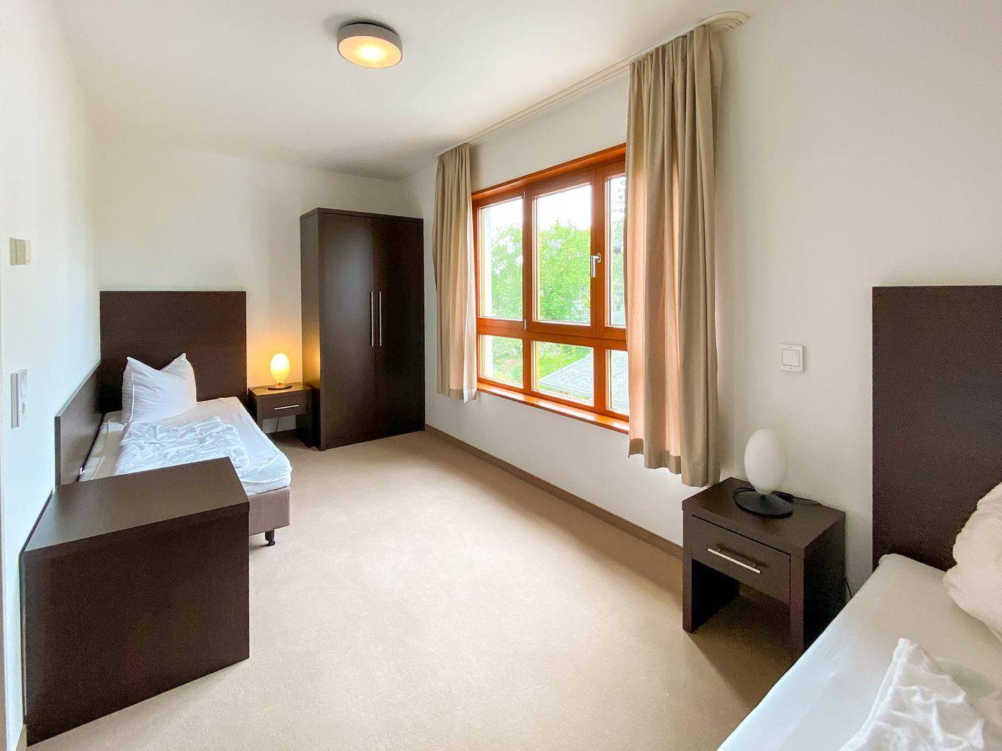 Das Apartment verfügt über ein Duschbad und zwei Schlafzimmer. Ein Schlafzimmer mit Doppelbett, das andere mit zwei Einzelbetten und einem kleinen Schreibtisch. Ein geräumiges Ambiente für die ganze Familie. Zum Apartment gehören ein PKW-Stellplatz und ein abschließbarer Fahrradschuppen.