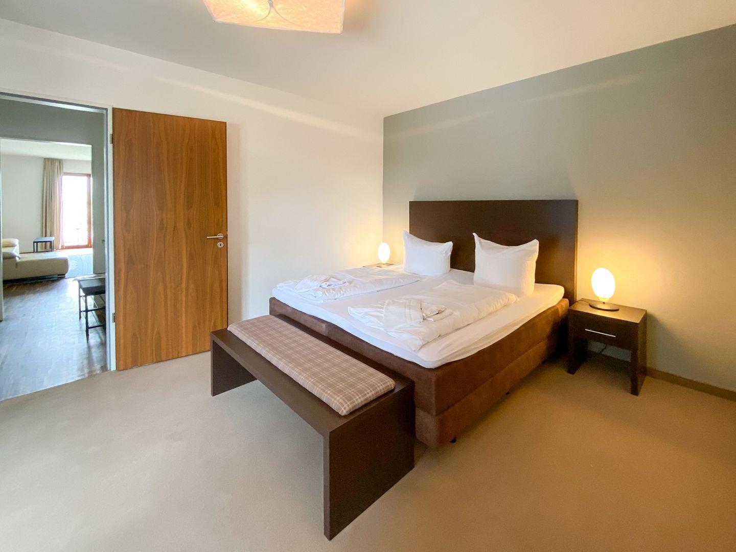 Das Apartment verfügt über ein Duschbad und zwei hintereinander liegende Schlafzimmer. Ein Schlafzimmer mit Doppelbett, das andere mit zwei Einzelbetten und einem kleinen Schreibtisch. Ein geräumiges Ambiente für die ganze Familie.