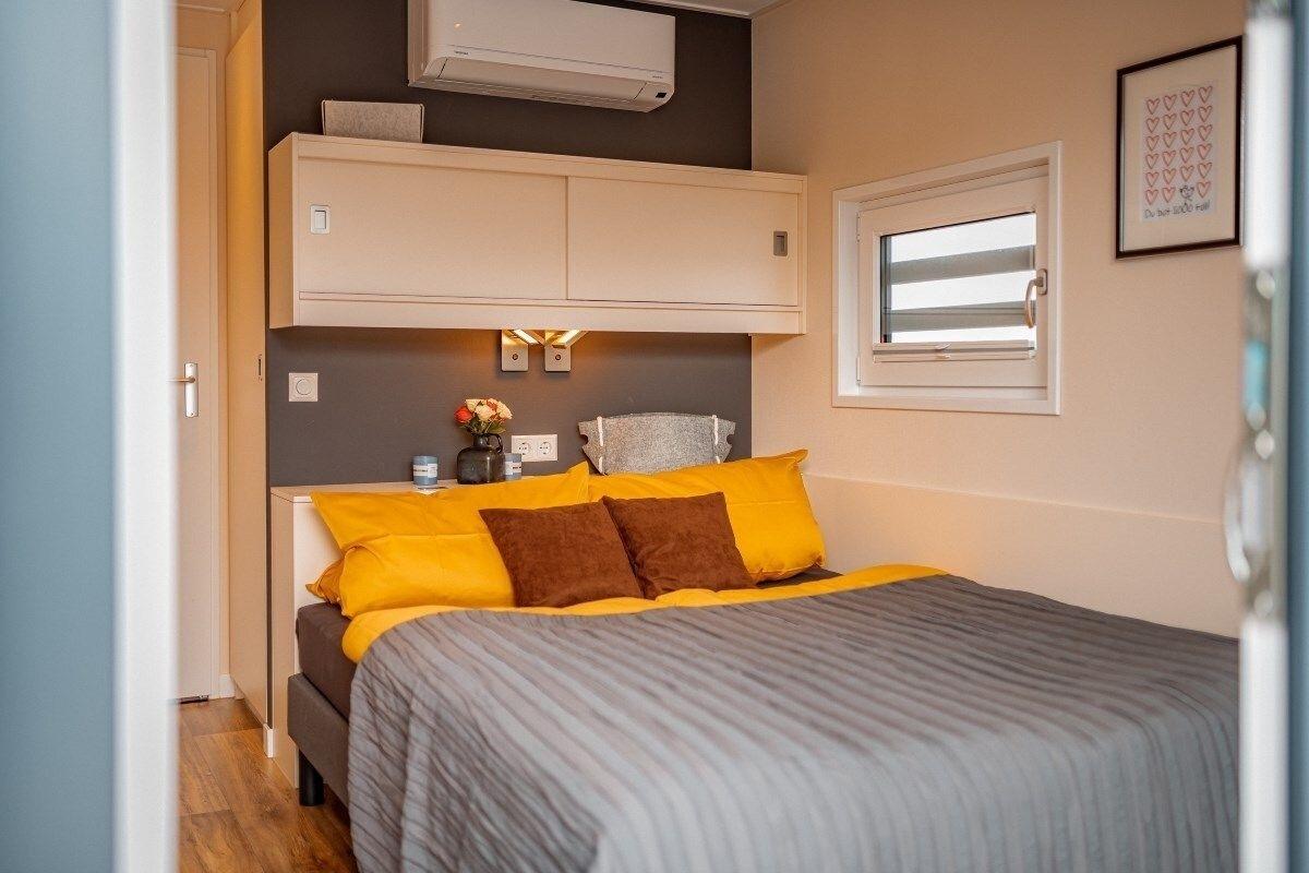 - zwei Schlafräume mit je einem komfortablen Doppelbett (1,60 x 2,00 m), je einem Einbauschrank mit 2x Ablagen und 1x Kleiderbügelstange mit 20x Holzkleiderbügeln, zusätzliche Hängeschränke über dem Bett mit Stauraum und Ablage, hochwertiger Satinbettwäsche, Bettbeleuchtung zum Lesen, Einbaudownlights, jeweils 1x Klima-Innengerät zum Heizen & Kühlen, seitlicher Sonnen- und Sichtschutz (Plissees), Insektenschutzgitter