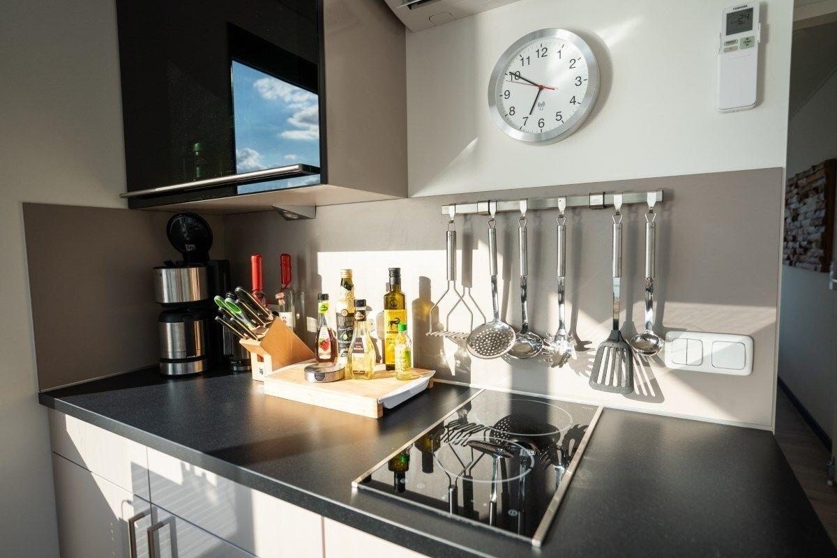 - Wohnküche mit Premiumvollausstattung von WMF, Villeroy & Boch, Liebherr und Miele (incl. Kühlschrank, Ceranfeld, Geschirrspüler, Mikrowelle mit Grill, Filter-Kaffeemaschine, Espressokocher, Milchaufschäumer, Toaster, Wasserkocher, Geschirr, Besteck, Küchenhelfer, Fondueset, Raclettegrill, Unterbaubeleuchtung, Klima-Innengerät zum Heizen, Kühlen und Entfeuchten, seitlicher Sonnen- und Sichtschutz (Plissees), Insektenschutzgitter, etc.
