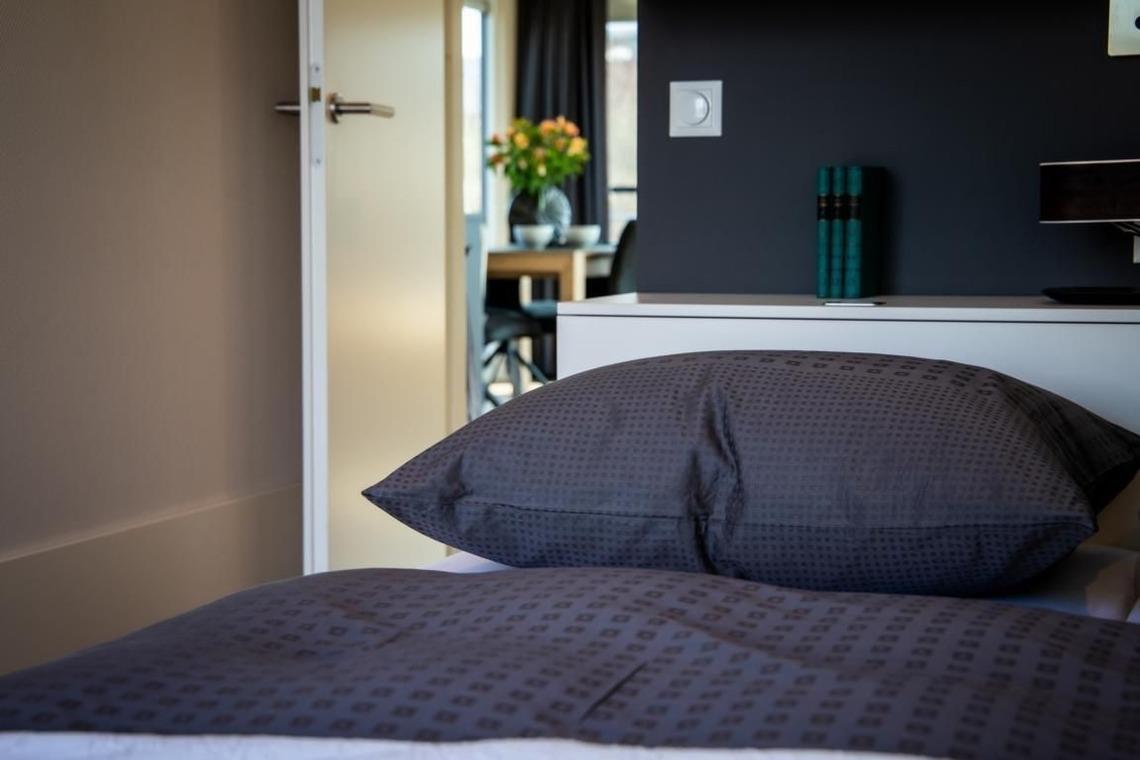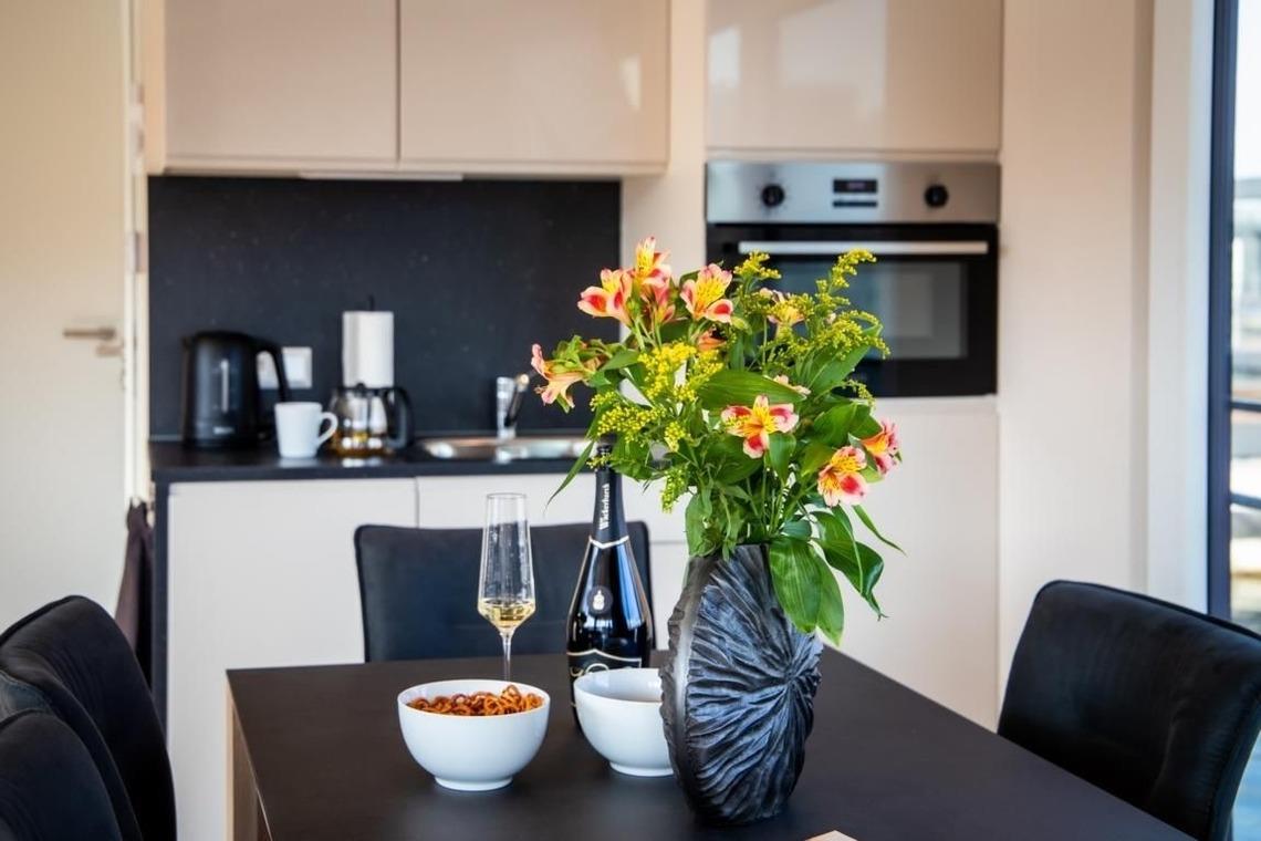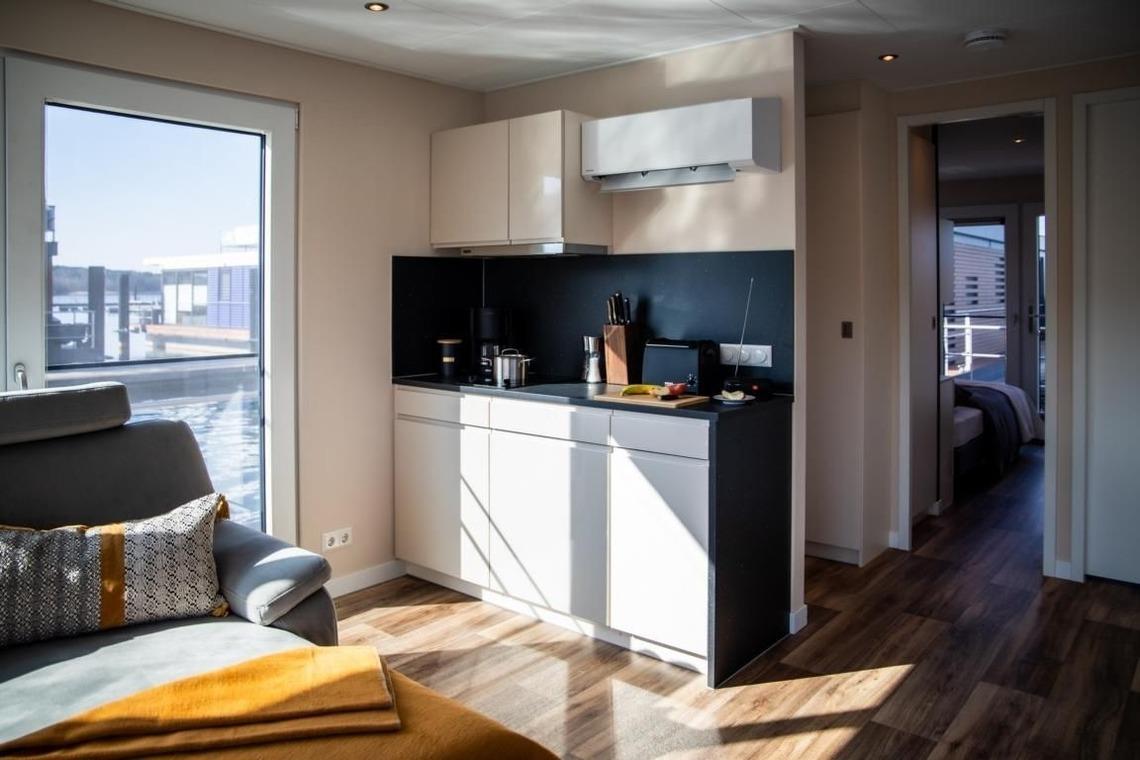 Ein Gas-Kaminofen im Wohnraum sorgt für Gemütlichkeit an kühleren Abenden. Getrennt steuerbare Klimaanlagen in beiden Schlafzimmern und dem Wohnraum ermöglichen jedem Gast die perfekte Temperierung des jeweiligen Aufenthaltsraumes. Badezimmer und WC sind mit Heizungen ausgestattet. An allen Fenstern und Türen des Floatinghouses sind Sichtschutz-Plissees oder Vorhänge angebracht. Die offene Küche ist mit einem Glaskeramikkochfeld (2 Platten) und einem Backofen in ergonomischer Einbauhöhe eingerichtet. Für den alltäglichen Komfort findet sich neben dem Kühlschrank auch ein Geschirrspüler.