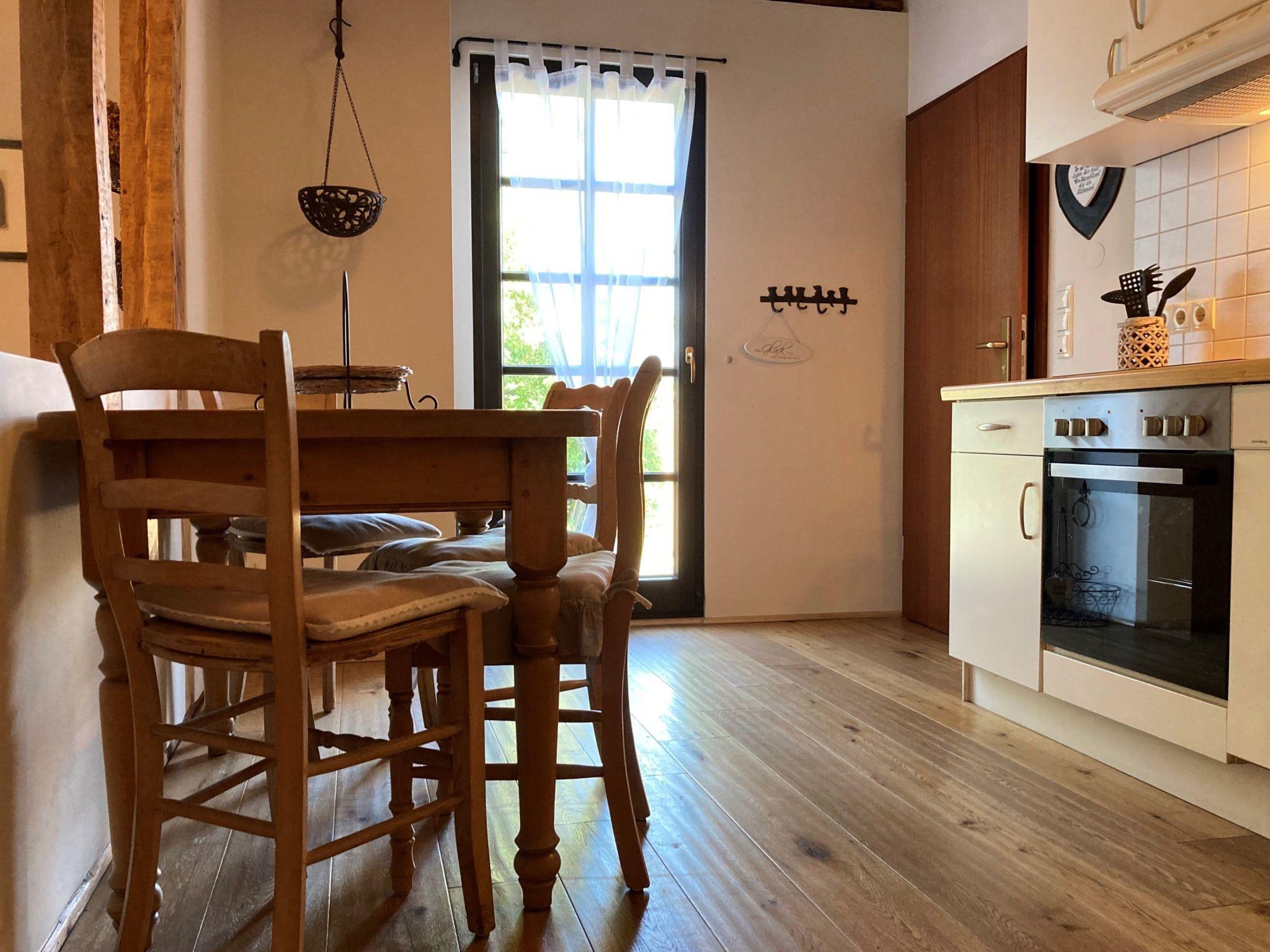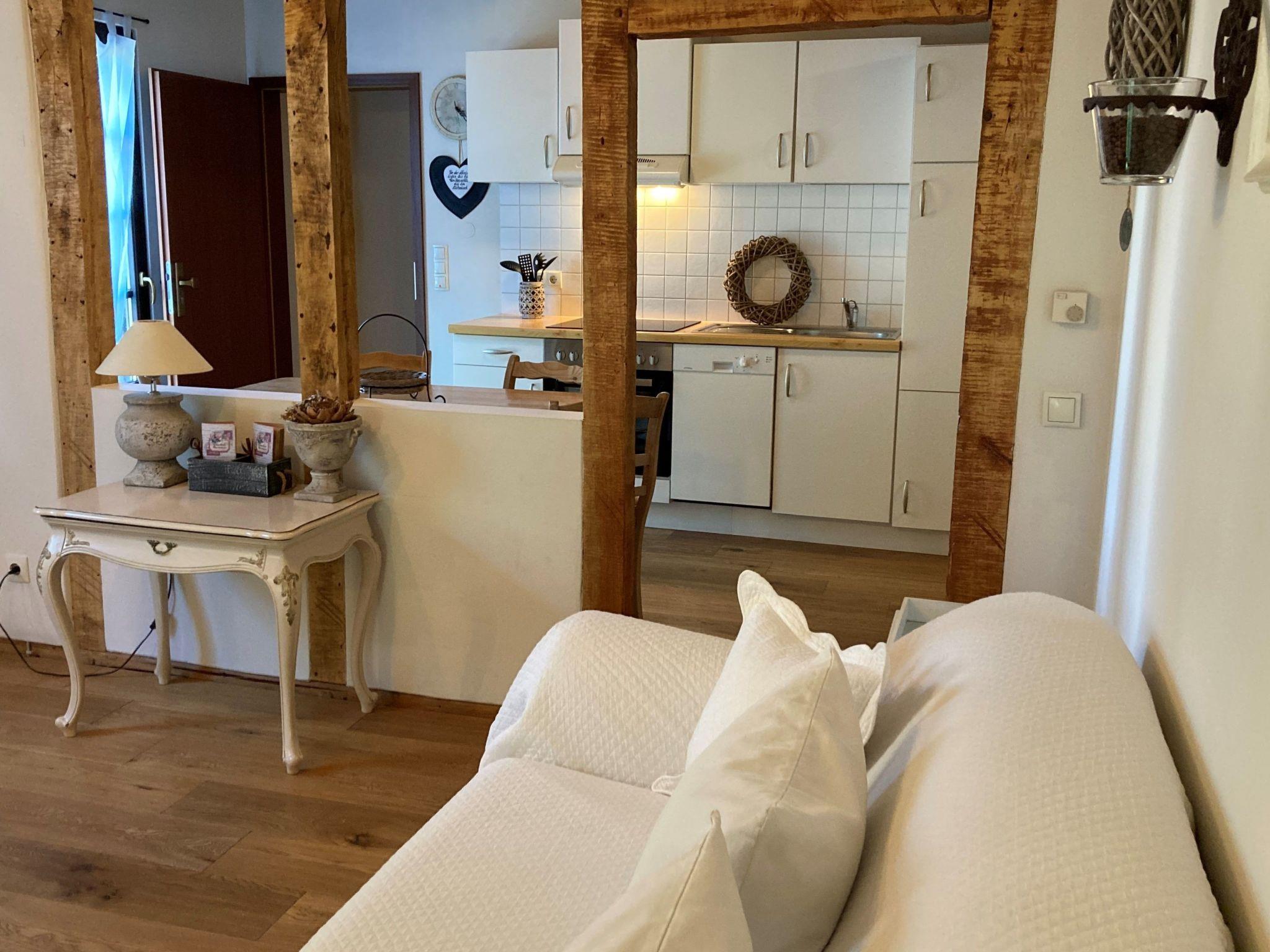 We offer you a cosy 2-room non-smoking flat in country house style, 55 m² in size, max. up to 4 persons, with parquet floor, underfloor heating, W-lan and satellite TV. One bedroom with 1,60m. Double bed and a living room with a pull-out sofa bed for 2 persons. The kitchen is fully equipped with kettle, coffee machine, dishwasher, toaster and a cooker (ceramic hob/oven), modern bathroom with walk-in shower.