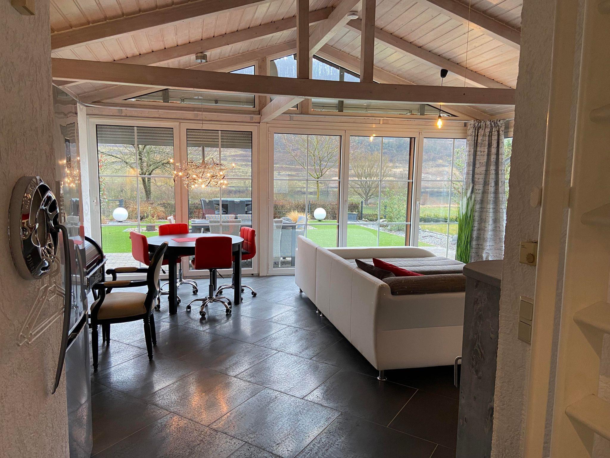 Luxuriös eingerichtetes 5-Sterne Ferienhaus ideal für längere Urlaube. In sehr ruhiger Lage- mit unverbautem Blick auf die Mosel. Optional entspannen Sie je nach Jahreszeit im eigenen Whirlpool im eigenen Garten mit Moselblick oder Sie genießen die Ruhe vor dem wärmenden Kaminfeuer.Das Haus steht in erster Reihe zur Mosel auf einem großzügigen Grundstück mit angelegtem Kunstrasen. Direkter Zugang zum Moselradweg.