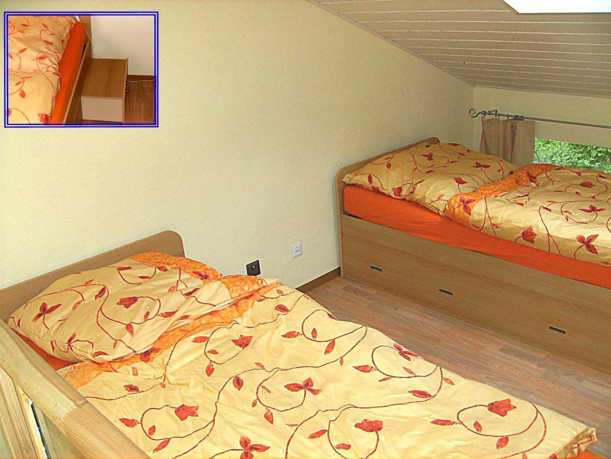 Eine Treppe führt in den oberen Stock, dort stehen die 2 Betten (90x200), die sowohl getrennt stehen können als auch zusammenschiebbar sind. Stumme Diener für die Ablage sind ebenfalls vorhanden.