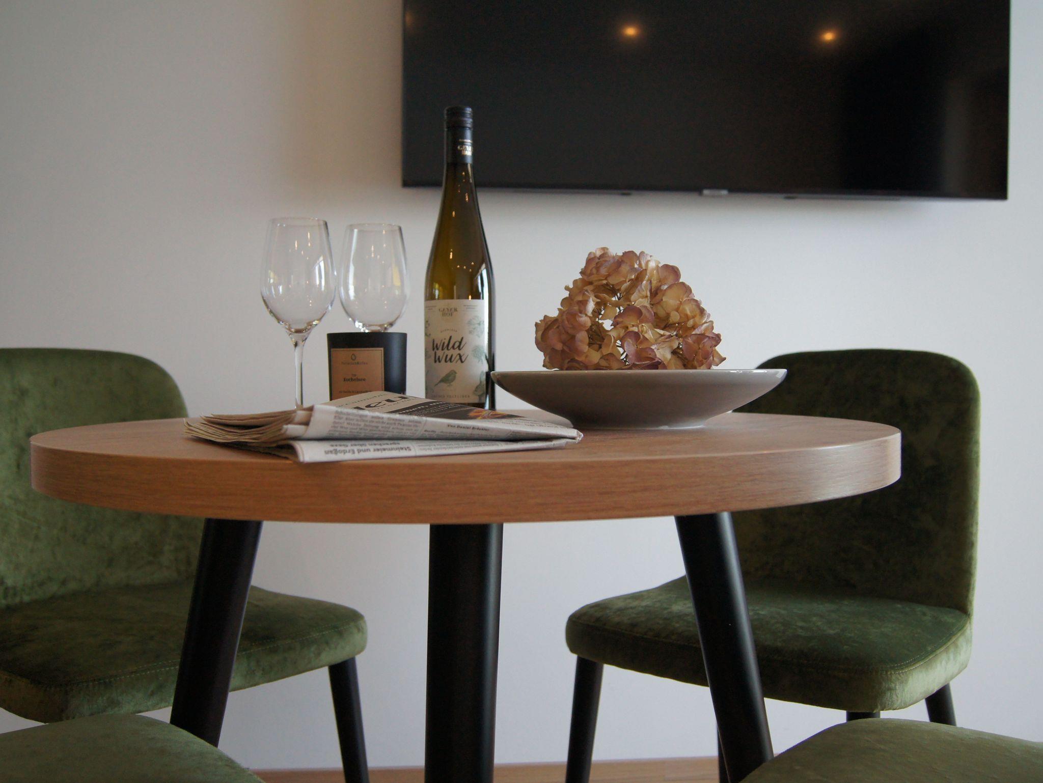 Die Apartments verfügen über ein Wohnzimmer (ca 30qm) mit gemütlichem Esstisch, einer Couch die man bequem in ein Zusatzbett umfunktionieren kann, einen großen Flat-TV für einen gemütlichen Fernseh-Abend und natürlich einen fantastischen Seeblick. Die integrierte und voll ausgestattete Designerküche ist mit einem Induktionsherd, Backofen, Espresso- und Spülmaschine ausgestattet. Selbstverständlich sind Kochutensilien, Geschirr, Gläser etc. vorhanden.