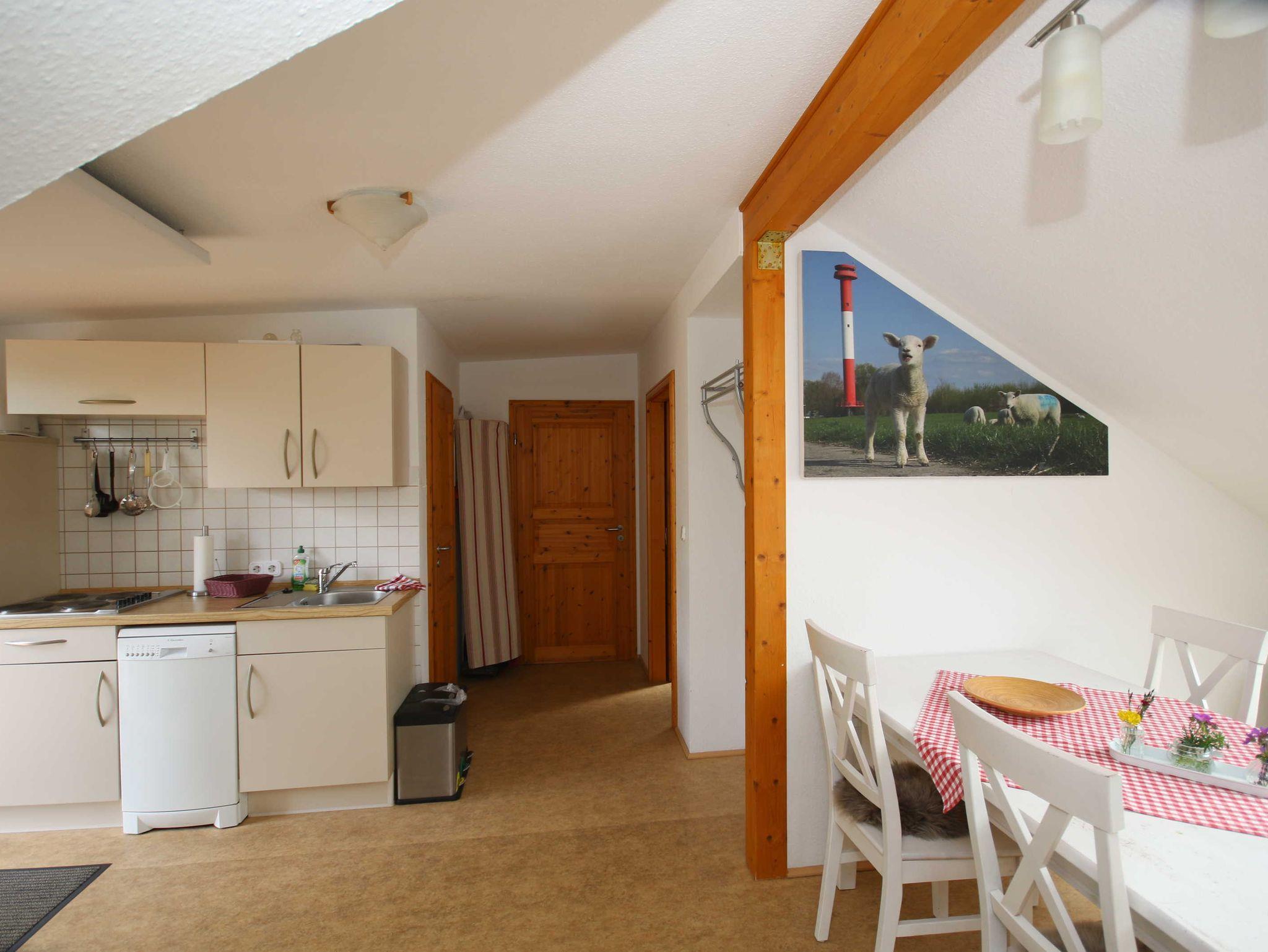 Die ca. 50 m² große Ferienwohnung hat einen separaten Eingang, eine großzügige neue Dachterrasse, ein Wohnzimmer, 2 Schlafzimmer, eine Küchezeile und ein Duschbad.