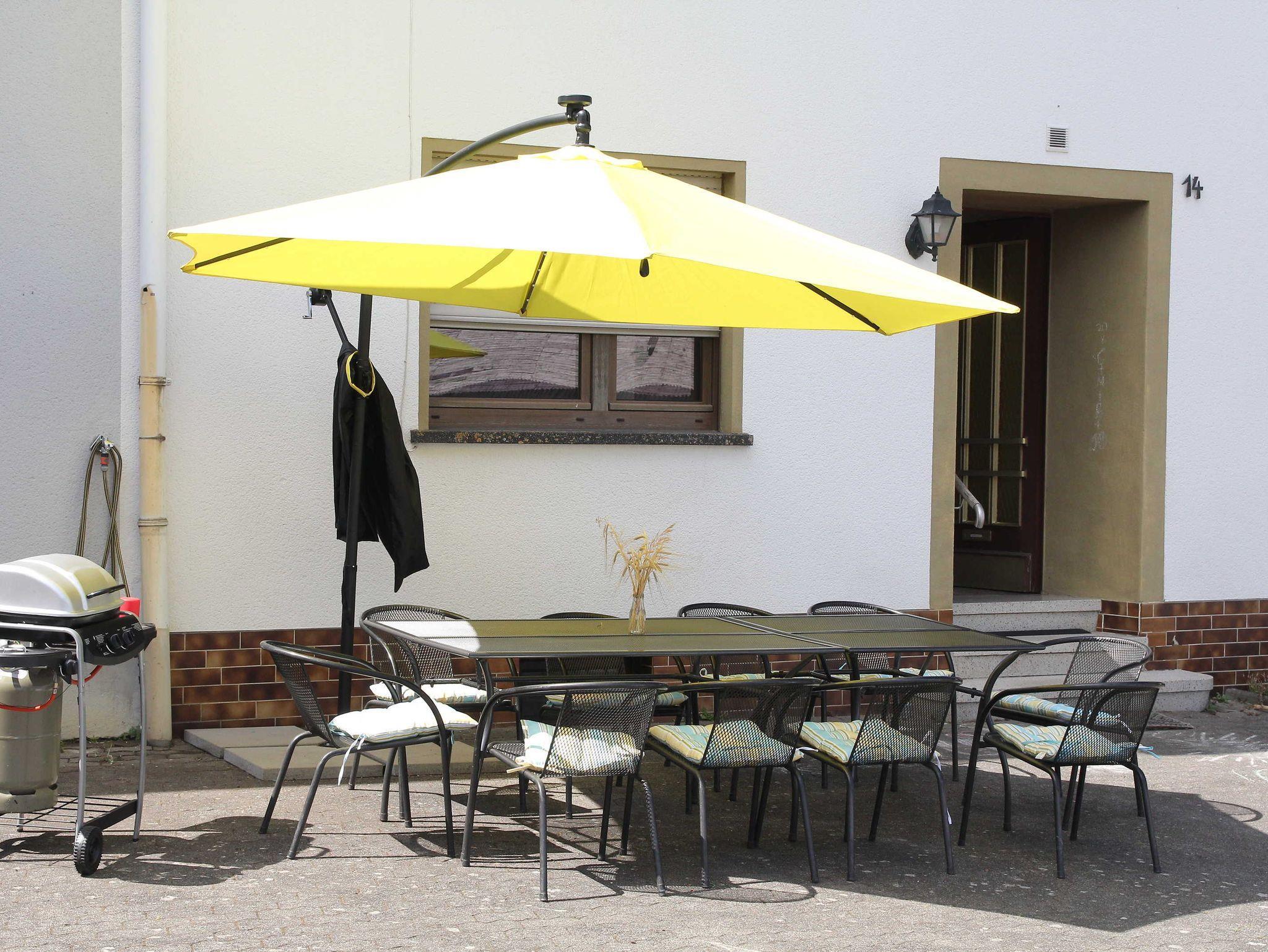 Vor dem Haus gibt es Sitzgelegenheiten mit Sonnenschirm sowie einen Grill.