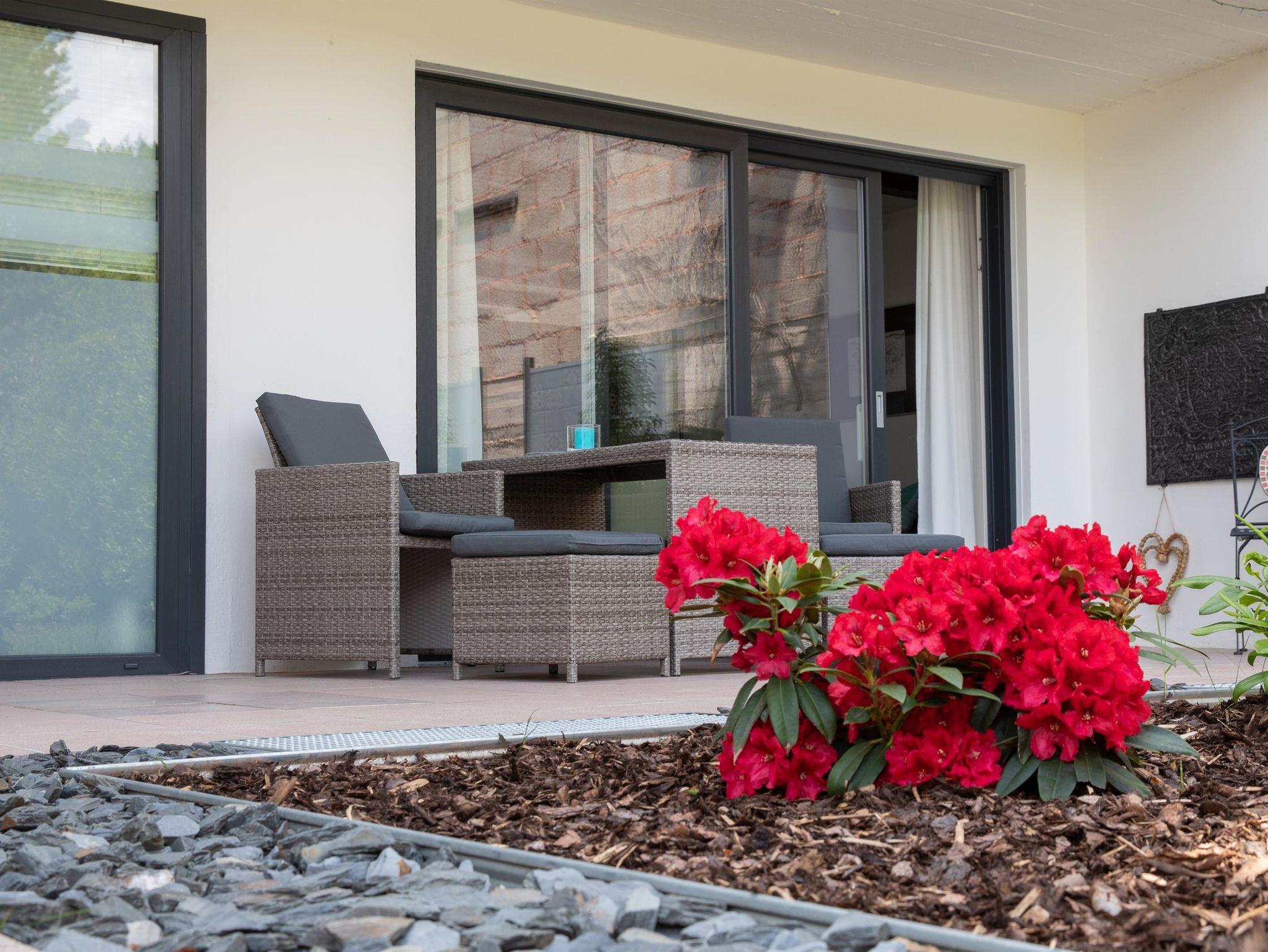 Das Ferienappartement Devonschiefer mit 55 qm verfügt über eine Küchenzeile mit Geschirrspülmaschine, Wohnbereich, Doppelbett, Bad mit Du/WC. Von der eigenen Terrasse können Sie einen herrlichen Gartenblick genießen.