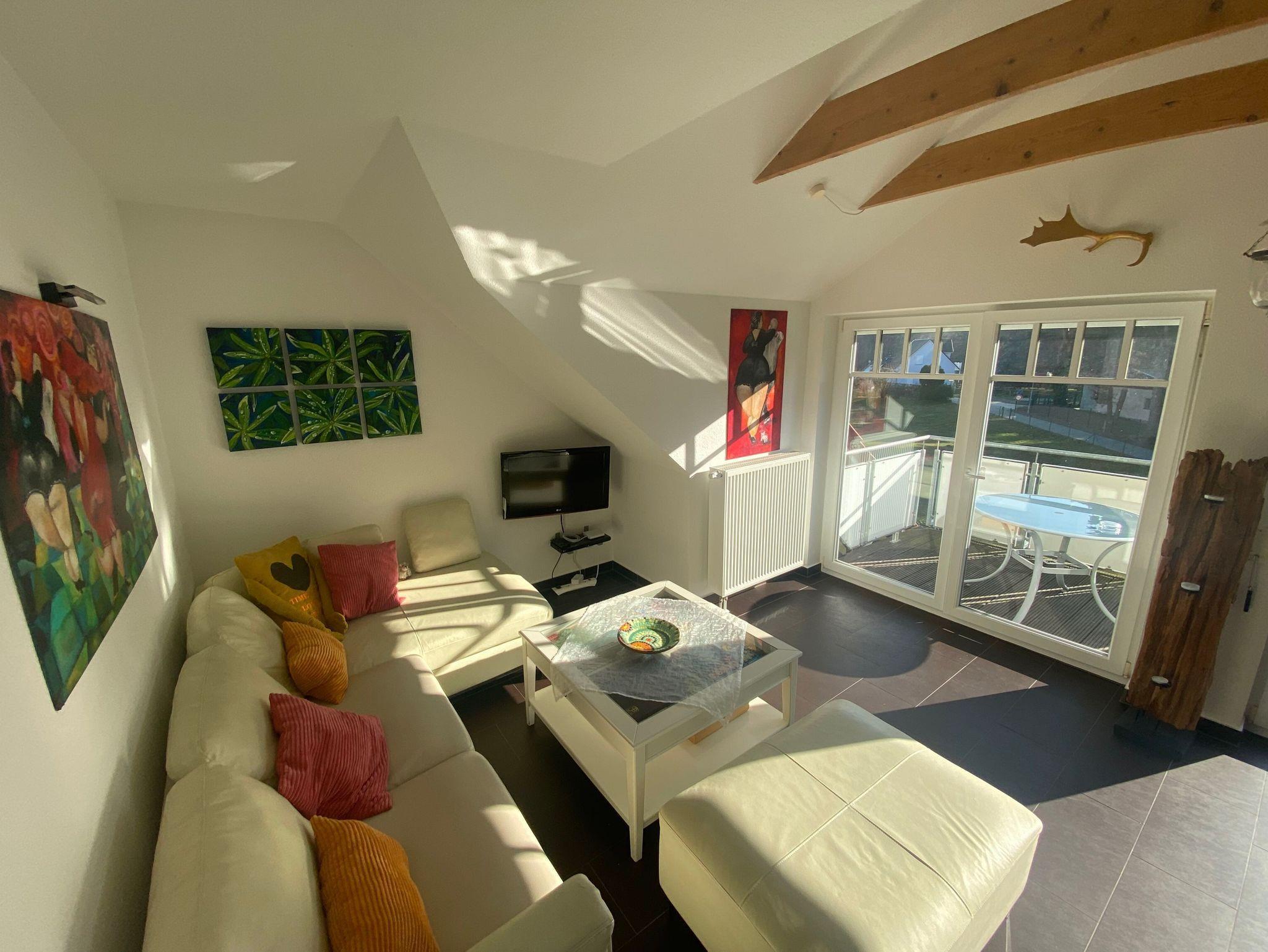 Die Wohnung liegt im Dachgeschoß des Ferienhauses. Sie verfügt über ein Schlafzimmer mit Doppelbett sowie ein weiteres Zimmer mit Einzelbett. Im Wohnzimmer steht alternativ eine Schlafcouch zur Verfügung.