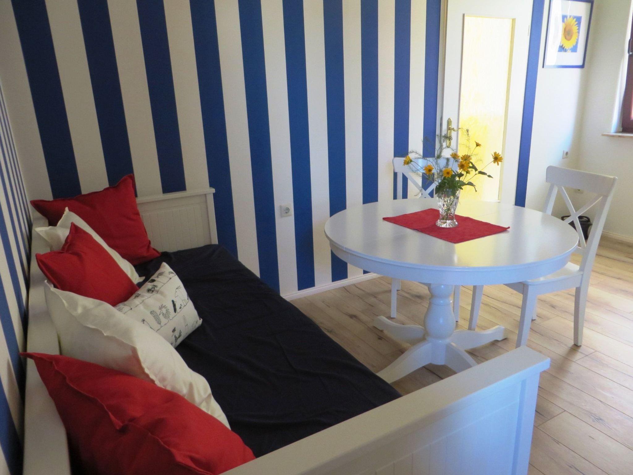 Unsere Ferienwohnung Midsommer ist ca. 35 Quadratmeter groß und im skandinavischen Stil gestaltet, um eine gemütliche Atmosphäre zum Verweilen zu schaffen. Die Küche ist gleichzeitig der Wohnbereich und bietet mit dem Tagessbett nicht nur einen Platz zum Sitzen, Lesen und Spielen, sondern auch eine separate Schlafmöglichkeit. Die Küchenzeile ist gut ausgestattet mit einem Cerankochfeld mit Backofen, einem Kühlschrank mit Gefrierfach, Wasserkocher, Toaster und Kaffeemaschine ? so fehlt es an nichts.