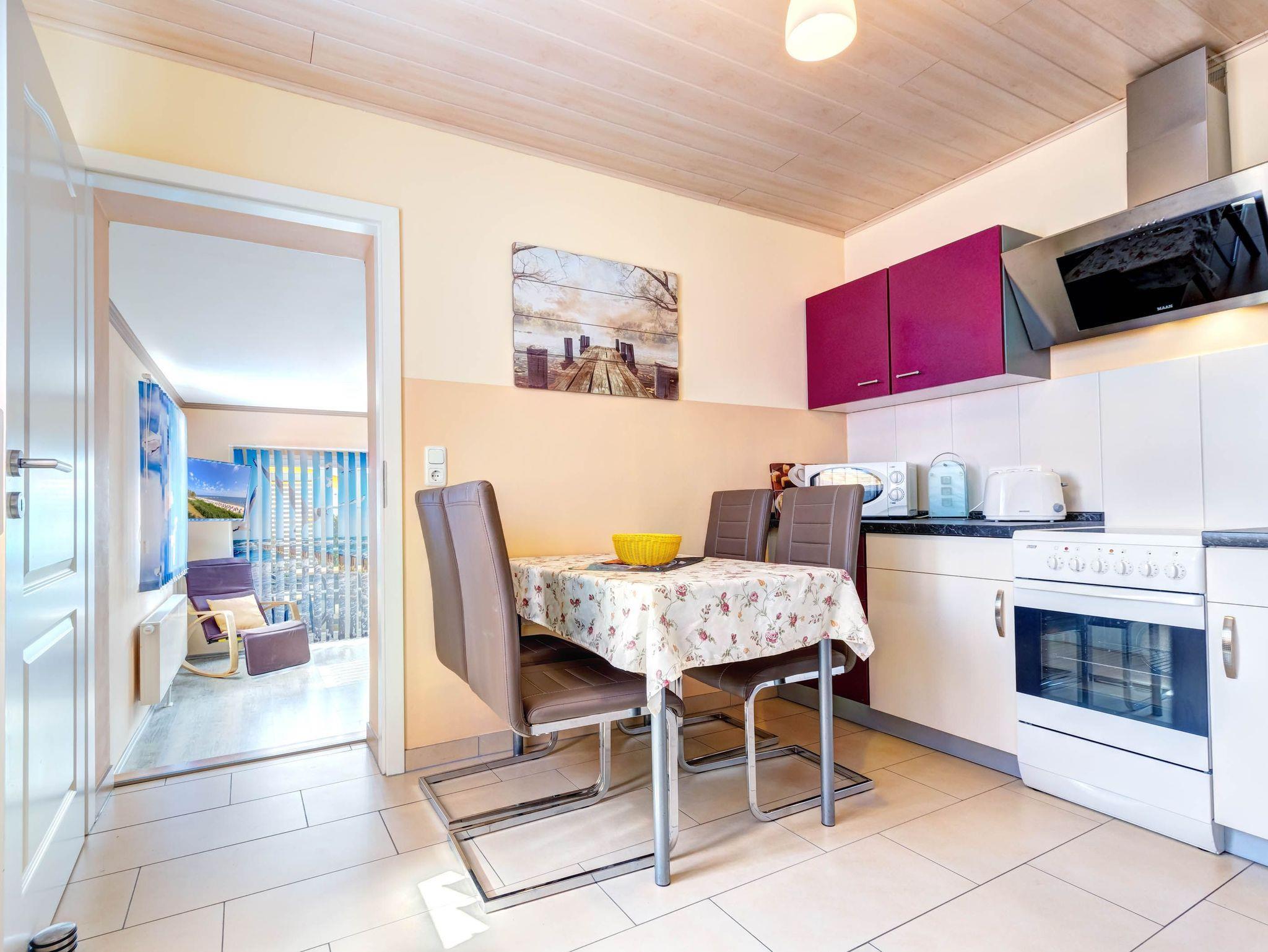 Die Ferienwohnung 04 liegt im Erdgeschoss auf der rechten Seite des Hauses und bietet auf 46m² ausreichend Platz für bis zu 4 Personen plus Kleinkind. Der großzügige Wohnraum empfängt Sie mit einer komfortablen Couch, einem Flat-TV und ein Radio. Die Couch kann ausgezogen werden und bietet zwei Personen bequem Platz. Vom Wohnraum aus können Sie auf Ihre private Terrasse treten, wo Sie ein Tisch und vier Stühle erwarten. Über eine kleine Treppe mit drei Stufen gelangen Sie in die voll ausgestattete Küche mit Esstisch.