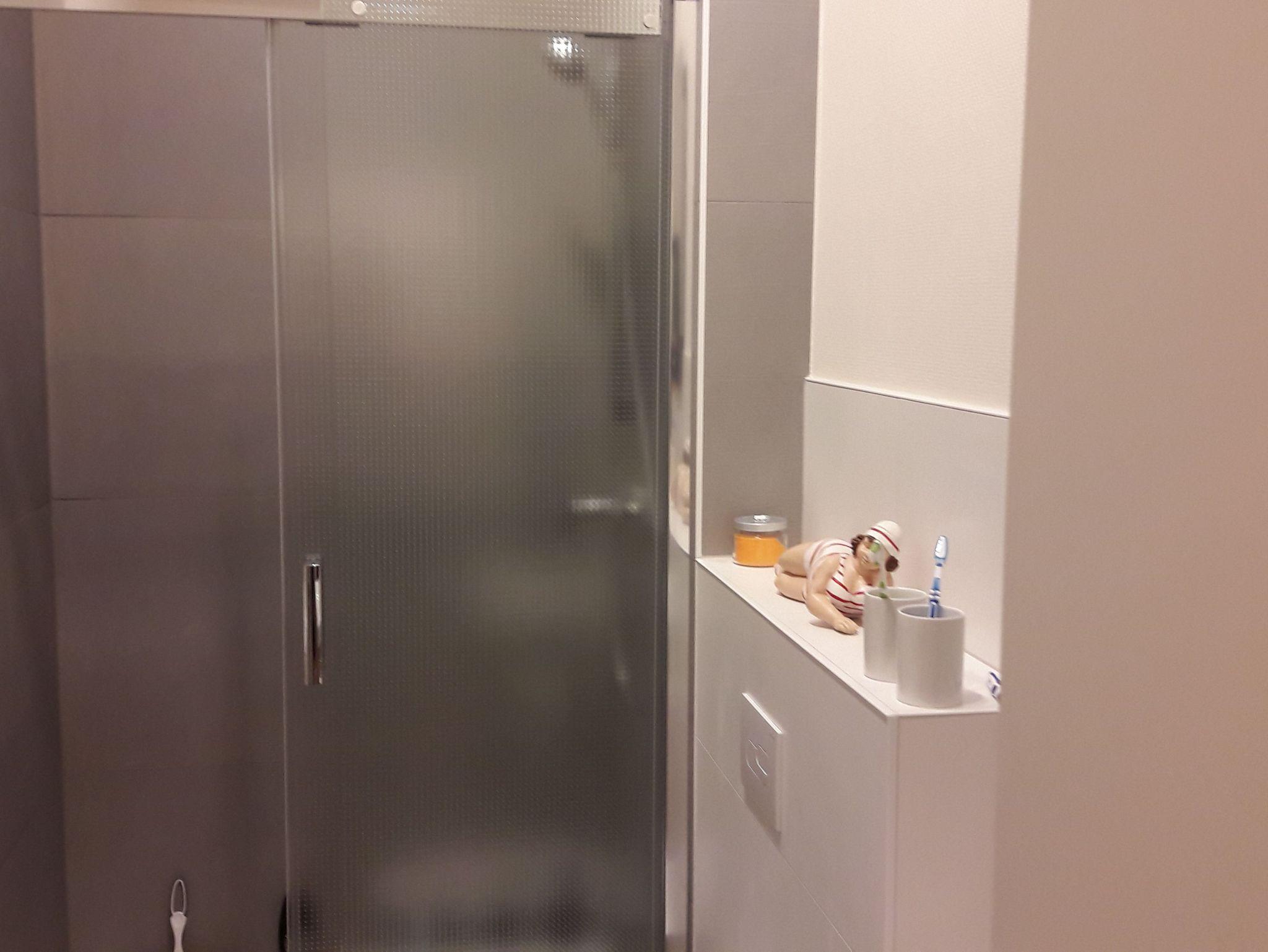 Unser Wohlfühlbad mit Tageslicht ausgestattet mit Waschbecken, großer Dusche, WC.