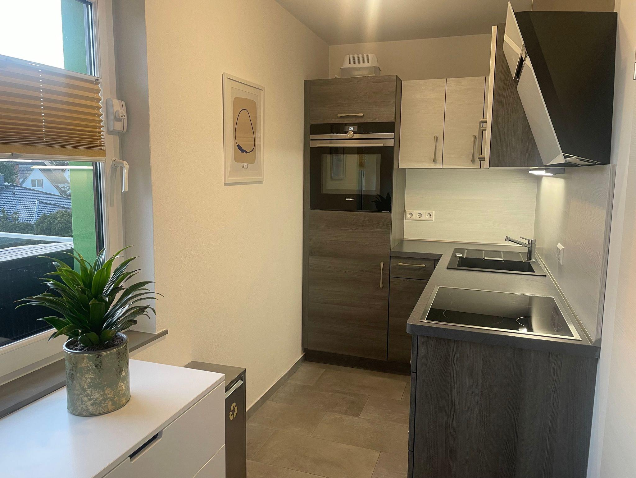 Die helle, mit Liebe zum Detail eingerichtete und mit separatem Eingang ausgestattete 2-Zimmer-Ferienwohnung ist ca. 50m² groß. Die Wohnung hat zwei separate Schlafzimmer und bietet Platz für 3 Personen. Im Souterrain-Bereich gelangen Sie direkt in die gemütliche Wohnküche mit Essecke. Über einen Flur mit Garderobe sind die beiden Schlafzimmer und das große Badezimmer zu erreichen. Eines der beiden Schlafzimmer verfügt über ein Doppelbett (1,80 x 2,00m) das andere Schlafzimmer über ein Etagenbett. Das Etagenbett hat unten eine Schlaffläche von 1,40 x 2,00m und oben 0,90 x 2,00m.