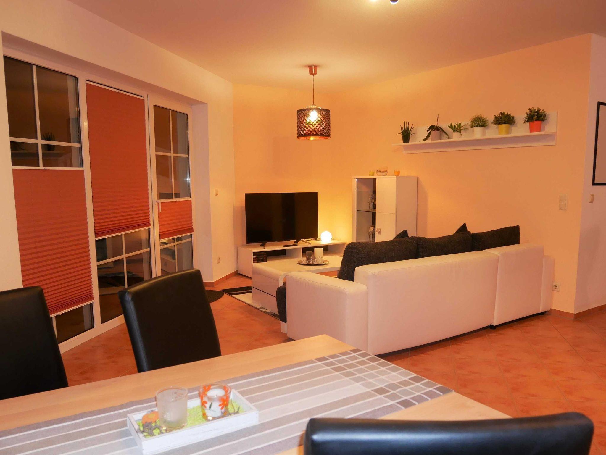 Die moderne und helle 2-Raum-Ferienwohnung verfügt über einen großzügigen Wohn-Essbereich mit gemütlicher Couch und FLAT-TV sowie einem Esstisch. Die offene Küche ist mit einem Cerankochfeld, Backofen, Geschirrspüler, Kühlschrank mit kleinem Gefrierfach, Mikrowelle, Toaster, Wasserkocher, Eierkocher und Filterkaffeemaschine ausgestattet. Das separate Schlafzimmer verfügt über ein Doppelbett, einen zusätzlichen FLAT-TV und einen großen Kleiderschrank für Ihre Urlaubsgarderobe. Ein verdunkelndes Plissee und Insektenschutzgaze sorgen für ungestörten Schlaf. Das moderne Badezimmer erwartet Sie mit einer bodengleichen Walk-In Dusche, Waschtisch, Handtuchheizung, WC und Fön. Vom Wohnbereich gelangen Sie auf die sonnige, möblierte Terrasse. Auf Wunsch spendet eine Markise Schatten. Ein PKW-Stellplatz steht Ihnen in der hauseigenen Tiefgarage zur Verfügung. Die Erstausstattung Bettwäsche & Handtücher ist inklusive.