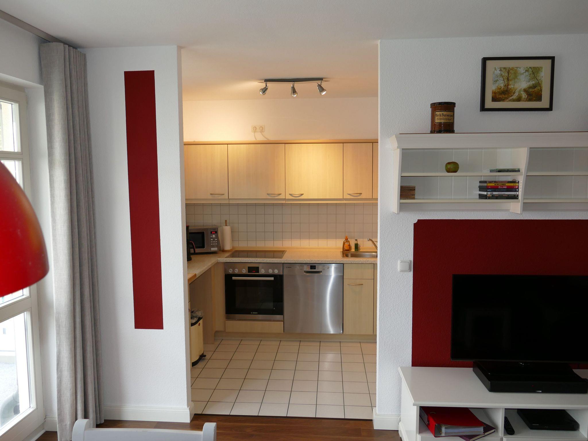 Vom Wohnzimmer gelangt man auf den Balkon in Südlage. Dieser ist je nach Jahreszeit mit Tisch und Stühlen so wie Auflagen ausgestattet. Die großzügige Einbauküche ist voll ausgestattet und beinhaltet u.a. Spülmaschine, Kühlschrank, Umluftherd mit Ceran- Kochfeld, Kaffeemaschine, Toaster, Wasserkocher und ein Microwellengerät.