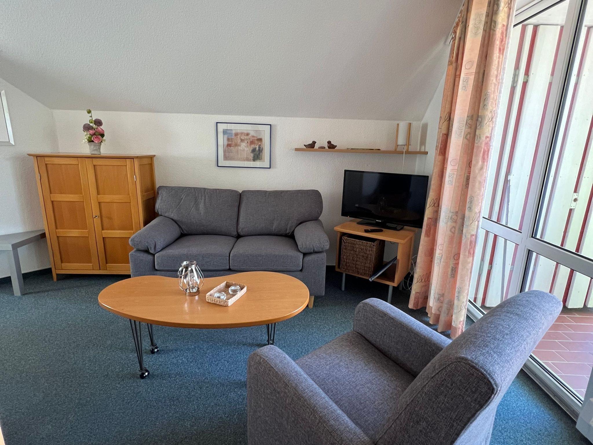 Dieses gepflegte Nichtraucherappartement, innerhalb der Ferienanlage 'Seeblick', befindet sich im 2.OG eines Gästehauses (Baujahr 1999) und verfügt über Dusche/WC, Wohnraum mit TV, Radio,offener Küche ( Kaffeemaschine, Kühlschrank usw.) und Zugang zum möblierten Balkon, sowie über zwei Schlafzimmer. Sie ist zentralbeheizt und für 2-4 Personen geeignet (Doppelbett im Schlafzimmer und 2 Einzelbetten im Schlafboden). Bettwäsche und Handtücher im Set sind Bestandteil der Buchung.